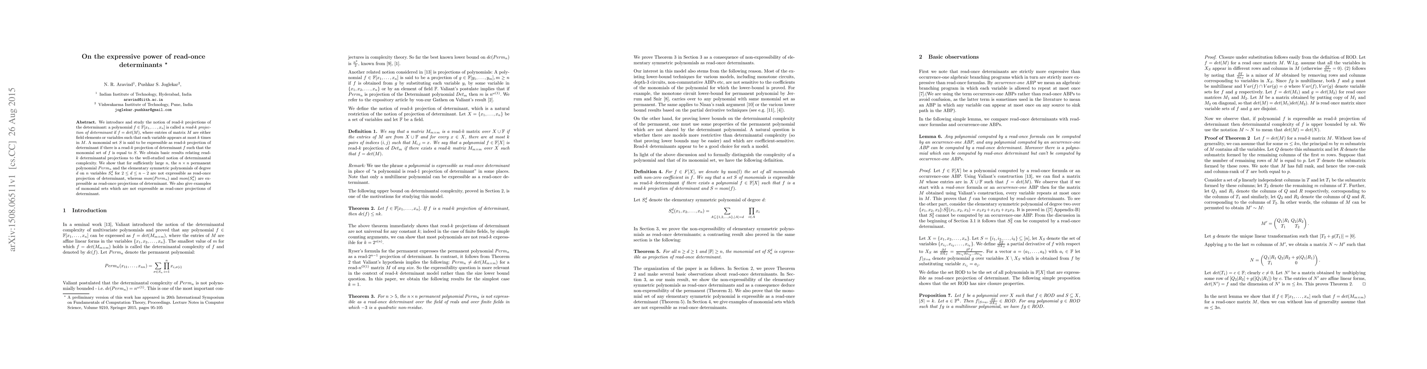This paper explores the concept of read-$k$ projections of determinants, focusing on polynomials where variables appear at most $k$ times. It establishes that certain polynomials like the permanent and elementary symmetric polynomials cannot be expressed as read-once projections, while their monomial sets can.