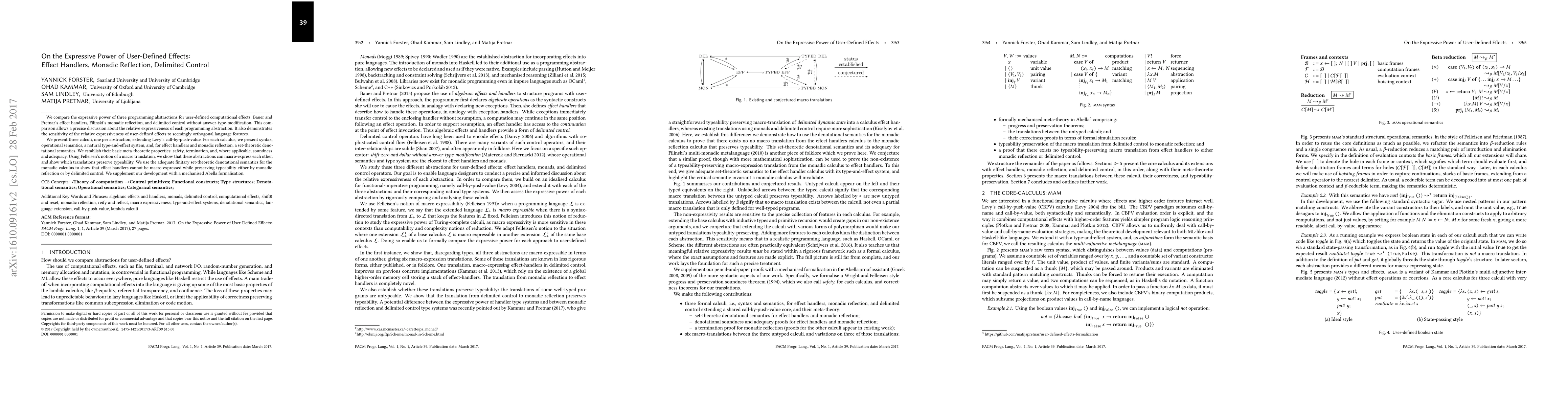 We compare the expressive power of three programming abstractions for user-defined computational effects: Bauer and Pretnar's effect handlers, Filinski's monadic reflection, and delimited control without answer-type-modification. This comparison allows a precise discussion about the relative expressiveness of each programming abstraction. It also demonstrates the sensitivity of the relative expressiveness of user-defined effects to seemingly orthogonal language features. We present three calculi, one per abstraction, extending Levy's call-by-push-value. For each calculus, we present syntax, operational semantics, a natural type-and-effect system, and, for effect handlers and monadic reflection, a set-theoretic denotational semantics. We establish their basic meta-theoretic properties: safety, termination, and, where applicable, soundness and adequacy. Using Felleisen's notion of a macro translation, we show that these abstractions can macro-express each other, and show which translations preserve typeability. We use the adequate finitary set-theoretic denotational semantics for the monadic calculus to show that effect handlers cannot be macro-expressed while preserving typeability either by monadic reflection or by delimited control. We supplement our development with a mechanised Abella formalisation.