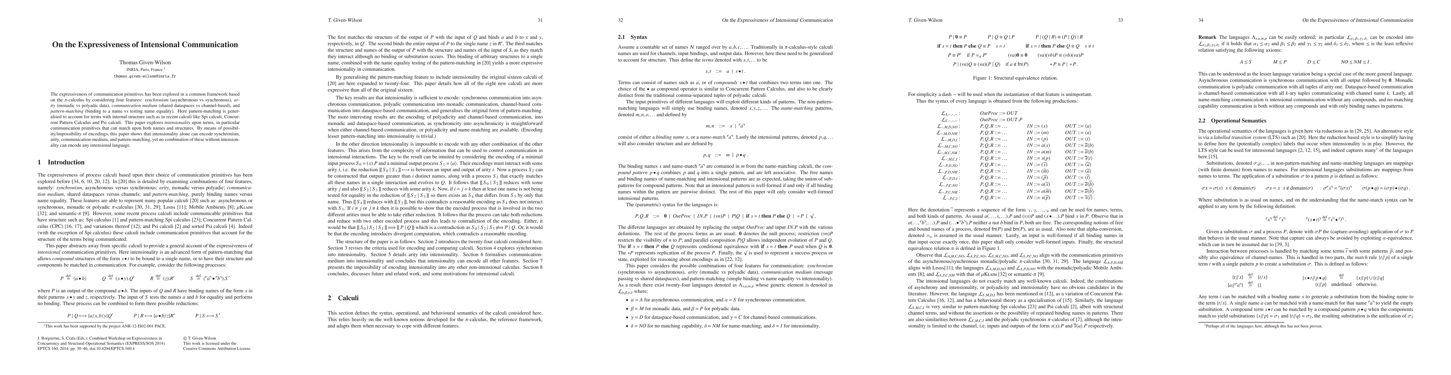 The expressiveness of communication primitives has been explored in a common framework based on the pi-calculus by considering four features: synchronism (asynchronous vs synchronous), arity (monadic vs polyadic data), communication medium (shared dataspaces vs channel-based), and pattern-matching (binding to a name vs testing name equality). Here pattern-matching is generalised to account for terms with internal structure such as in recent calculi like Spi calculi, Concurrent Pattern Calculus and Psi calculi. This paper explores intensionality upon terms, in particular communication primitives that can match upon both names and structures. By means of possibility/impossibility of encodings, this paper shows that intensionality alone can encode synchronism, arity, communication-medium, and pattern-matching, yet no combination of these without intensionality can encode any intensional language.