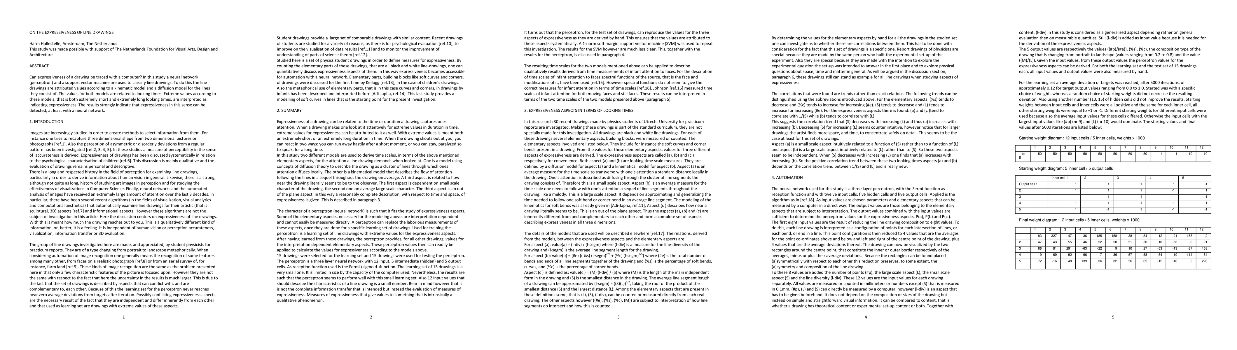 Can expressiveness of a drawing be traced with a computer? In this study a neural network (perceptron) and a support vector machine are used to classify line drawings. To do this the line drawings are attributed values according to a kinematic model and a diffusion model for the lines they consist of. The values for both models are related to looking times. Extreme values according to these models, that is both extremely short and extremely long looking times, are interpreted as indicating expressiveness. The results strongly indicate that expressiveness in this sense can be detected, at least with a neural network.