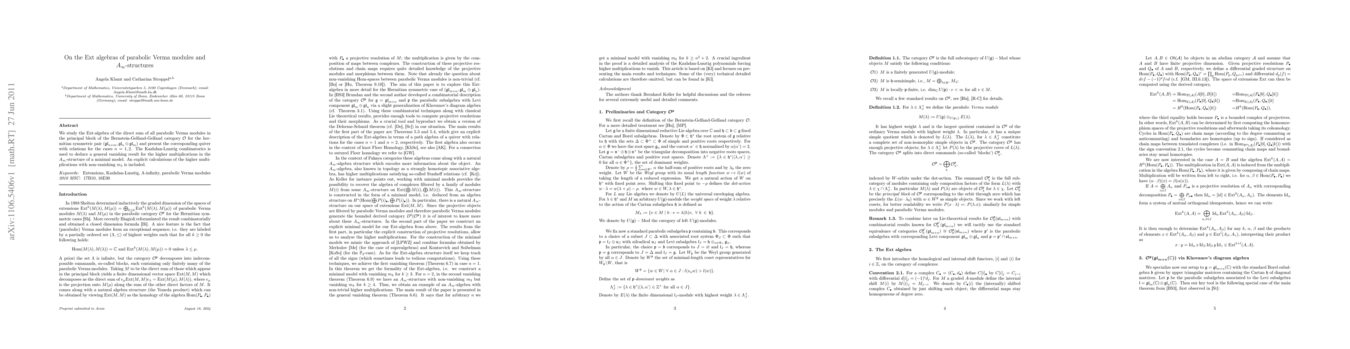 We study the Ext-algebra of the direct sum of all parabolic Verma modules in the principal block of the Bernstein-Gelfand-Gelfand category O for the hermitian symmetric pair $(\mathfrak{gl}_{n+m}, \mathfrak{gl}_{n} \oplus \mathfrak{gl}_m)$ and present the corresponding quiver with relations for the cases n=1, 2. The Kazhdan-Lusztig combinatorics is used to deduce a general vanishing result for the higher multiplications in the A infinity-structure of a minimal model. An explicit example of the higher multiplications with non-vanishing $m_3$ is included.