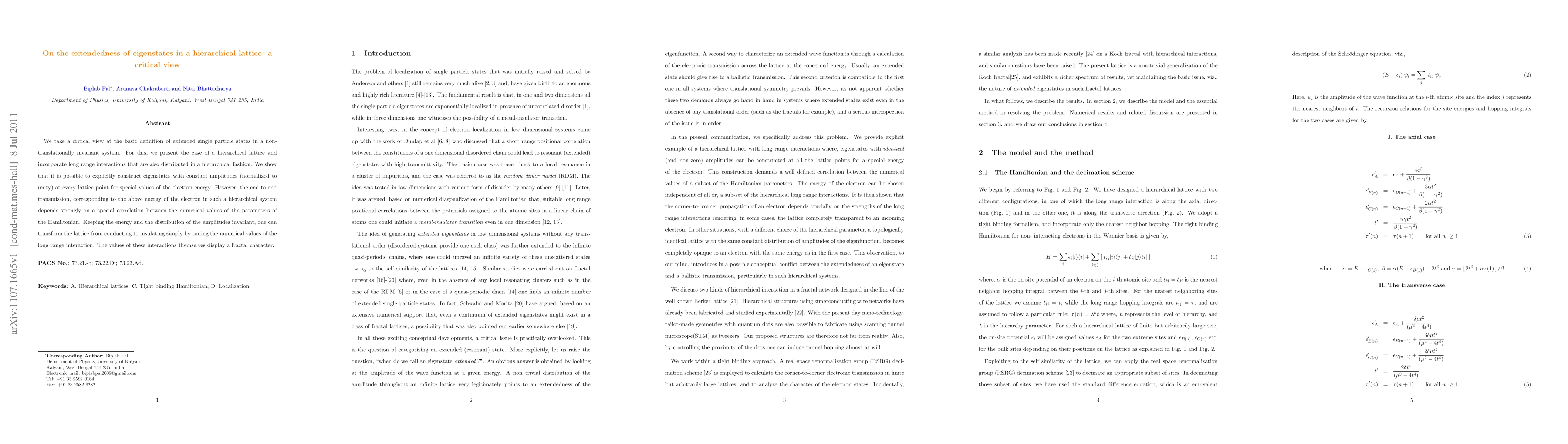 We take a critical view at the basic definition of extended single particle states in a non-translationally invariant system. For this, we present the case of a hierarchical lattice and incorporate long range interactions that are also distributed in a hierarchical fashion. We show that it is possible to explicitly construct eigenstates with constant amplitudes (normalized to unity) at every lattice point for special values of the electron- energy. However, the end-to-end transmission, corresponding to the above energy of the electron in such a hierarchical system depends strongly on a special correlation between the numerical values of the parameters of the Hamiltonian. Keeping the energy and the distribution of the amplitudes invariant, one can transform the lattice from conducting to insulating simply by tunning the numerical values of the long range interaction. The values of these interactions themselves display a fractal character.