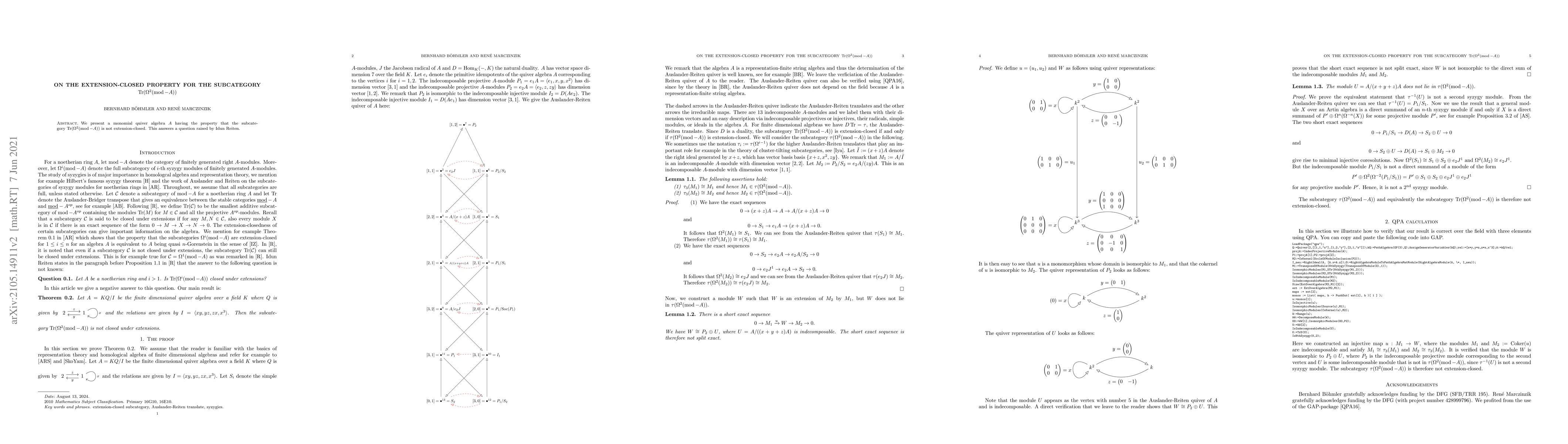 We present a monomial quiver algebra $A$ having the property that the subcategory $\text{Tr}(\Omega^2({\rm mod}-A))$ is not extension-closed. This answers a question raised by Idun Reiten.