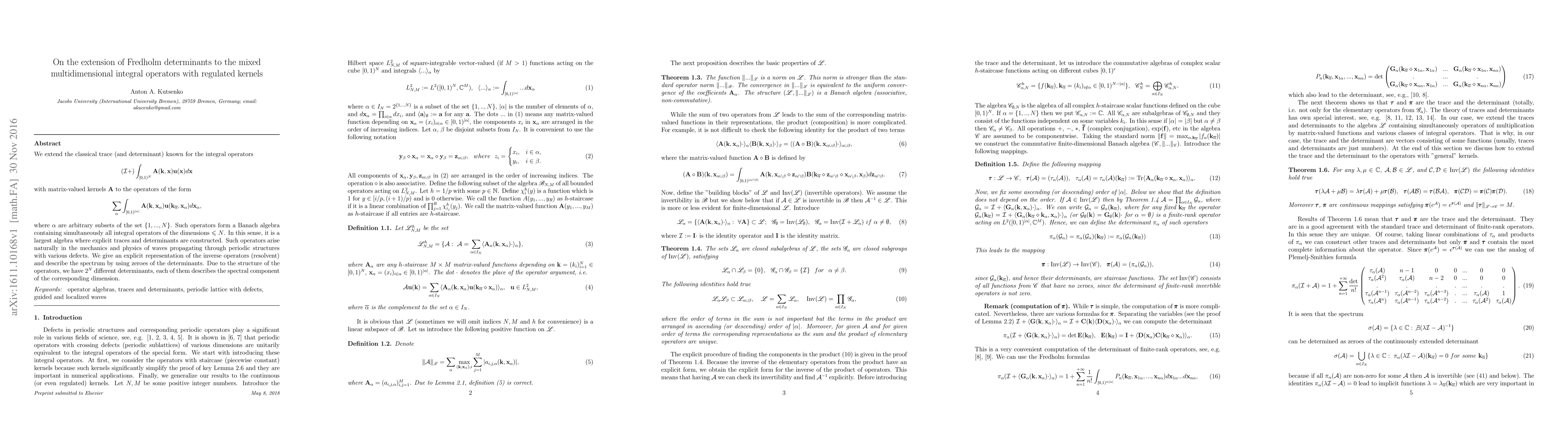 We extend the classical trace (and determinant) known for the integral operators $$ ({\mathcal I}+)\int_{[0,1)^N}{\bf A}({\bf k},{\bf x}){\bf u}({\bf x})d{\bf x} $$ with matrix-valued kernels ${\bf A}$ to the operators of the form $$ \sum_{\alpha}\int_{[0,1)^{|\alpha|}}{\bf A}({\bf k},{\bf x}_{\alpha}){\bf u}({\bf k}_{\overline{\alpha}},{\bf x}_{\alpha})d{\bf x}_{\alpha}, $$ where $\alpha$ are arbitrary subsets of the set $\{1,...,N\}$. Such operators form a Banach algebra containing simultaneously all integral operators of the dimensions $\leqslant N$. In this sense, it is a largest algebra where explicit traces and determinants are constructed. Such operators arise naturally in the mechanics and physics of waves propagating through periodic structures with various defects. We give an explicit representation of the inverse operators (resolvent) and describe the spectrum by using zeroes of the determinants. Due to the structure of the operators, we have $2^N$ different determinants, each of them describes the spectral component of the corresponding dimension.