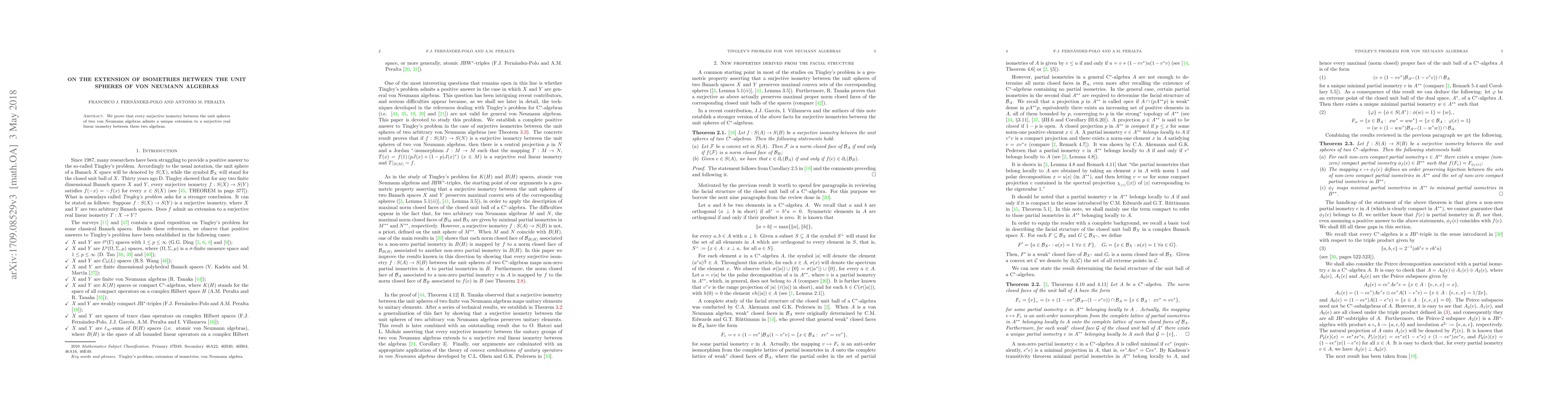 Summary: This paper demonstrates that every surjective isometry between the unit spheres of two von Neumann algebras can be uniquely extended to a surjective real linear isometry between the entire algebras. The significance lies in the preservation of the algebraic structure under such extensions.