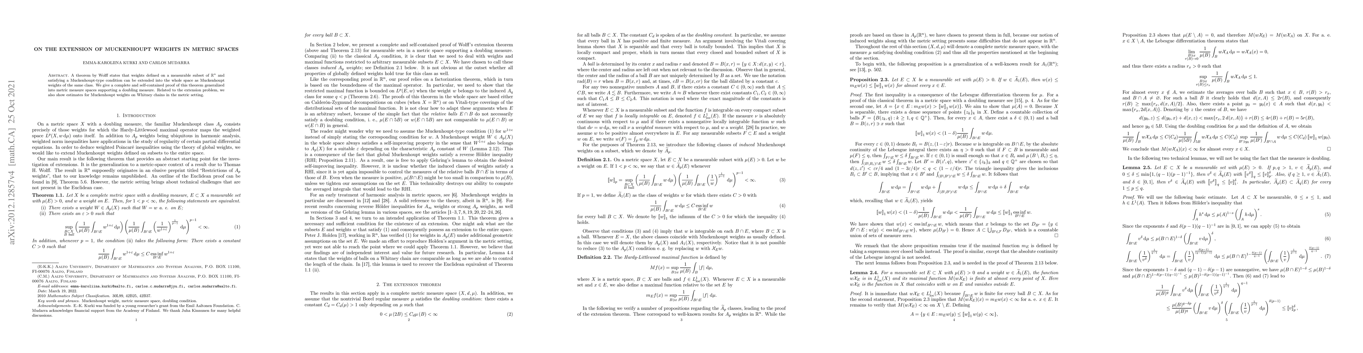 This paper generalizes Wolff's theorem on Muckenhoupt weights to metric measure spaces with a doubling measure, providing a complete proof and estimates for Muckenhoupt weights on Whitney chains in this setting.