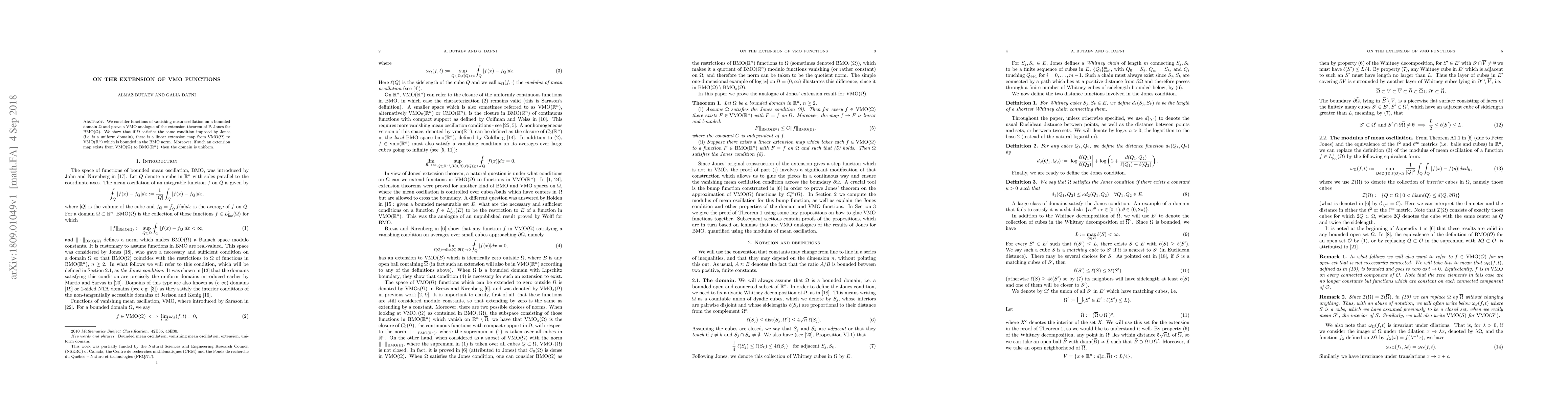This paper proves an extension theorem for VMO functions analogous to P. Jones's theorem for BMO functions, showing that if a bounded domain satisfies uniform domain conditions, there exists a bounded linear extension map from VMO functions on the domain to VMO functions in $\mathbb{R}^n$. It also establishes that the existence of such an extension to BMO functions implies the domain is uniform.