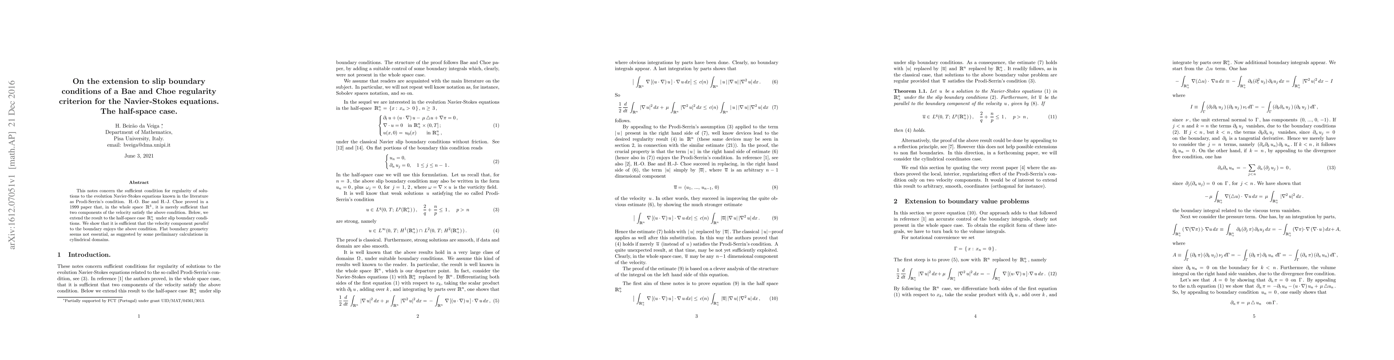 This notes concern the sufficient conditions for regularity of solutions to the evolution Navier-Stokes equations known in the literature as Prodi-Serrin's condition. H.-O. Bae and H.-J. Choe proved in a 1999 paper that, in the whole space R^3, it is merely sufficient that two components of the velocity satisfy the above condition. Below, we extend the result to the half-space case R^n_+ under slip boundary conditions. We show that it is sufficient that the velocity component parallel to the boundary enjoys the above condition. Flat boundary geometry seems not essential, as suggested by some preliminary calculations in cylindrical domains.