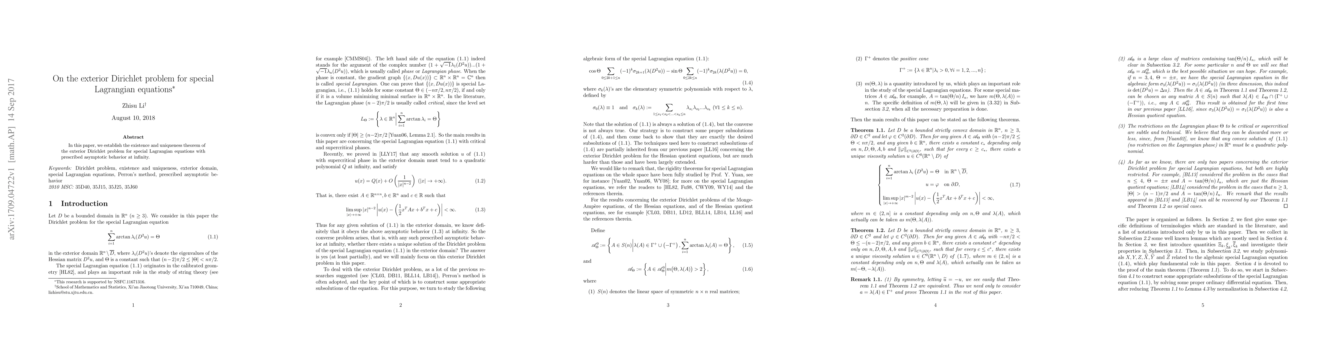 This paper proves the existence and uniqueness of solutions to the exterior Dirichlet problem for special Lagrangian equations, ensuring the prescribed asymptotic behavior at infinity.