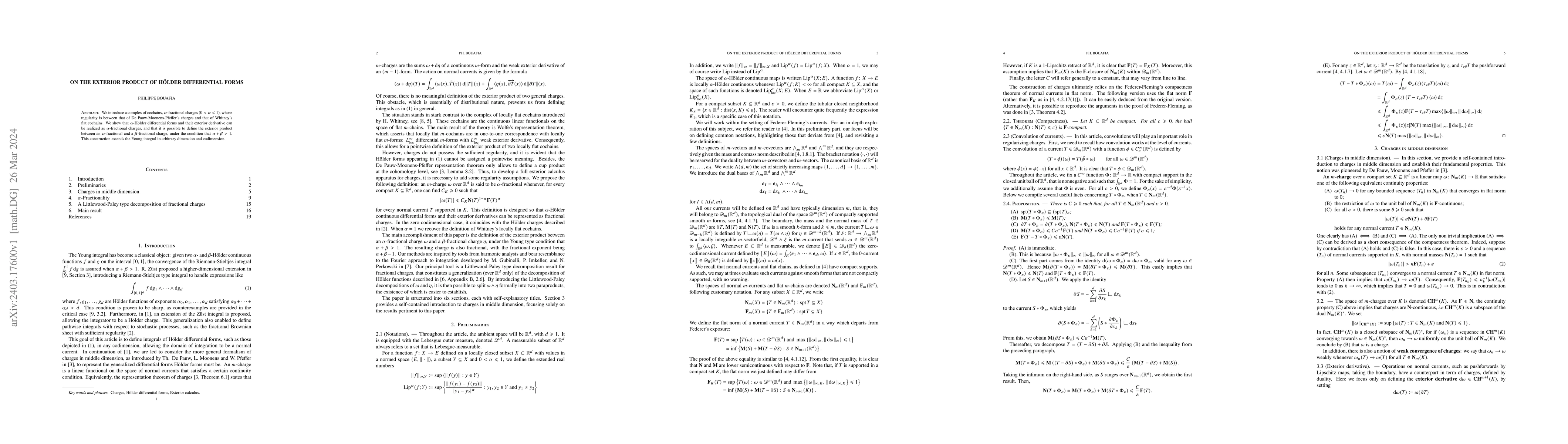 The paper introduces a complex of $\alpha$-fractional charges for $0 < \alpha \leq 1$, bridging the regularity between De Pauw-Moonens-Pfeffer's and Whitney's cochains. It demonstrates that $\alpha$-Hölder differential forms and their derivatives can be realized as these fractional charges, allowing for an exterior product definition under the condition $\alpha + \beta > 1$, extending the Young integral in any dimension.