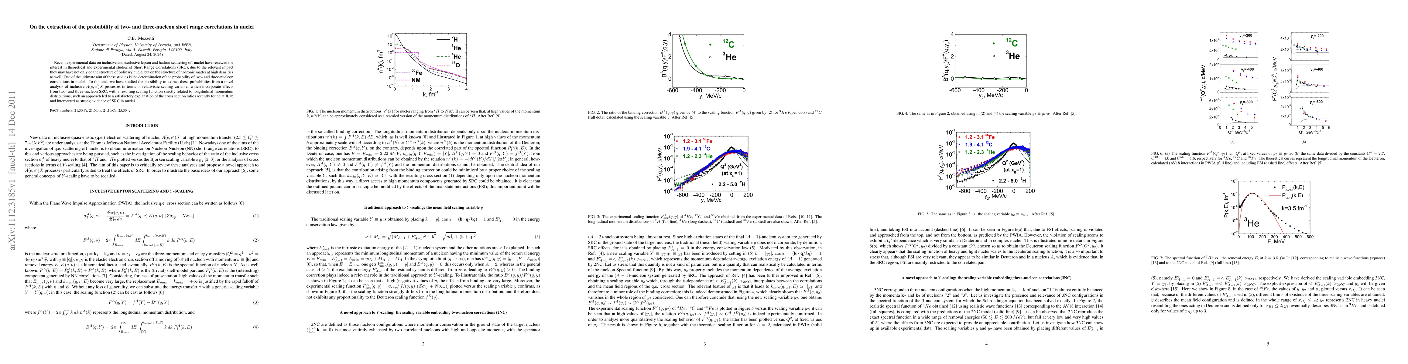Recent experimental data on inclusive and exclusive lepton and hadron scattering off nuclei have renewed the interest in theoretical and experimental studies of Short Range Correlations (SRC), due to the relevant impact they may have not only on the structure of ordinary nuclei but on the structure of hadronic matter at high densities as well. One of the ultimate aim of these studies is the determination of the probability of two- and three-nucleon correlations in nuclei. To this end, we have studied the possibility to extract these probabilities from a novel analysis of inclusive A(e, e')X processes in terms of relativistic scaling variables which incorporate effects from two- and three-nucleon SRC, with a resulting scaling function strictly related to longitudinal momentum distributions; such an approach led to a satisfactory explanation of the cross section ratios recently found at JLab and interpreted as strong evidence of SRC in nuclei.