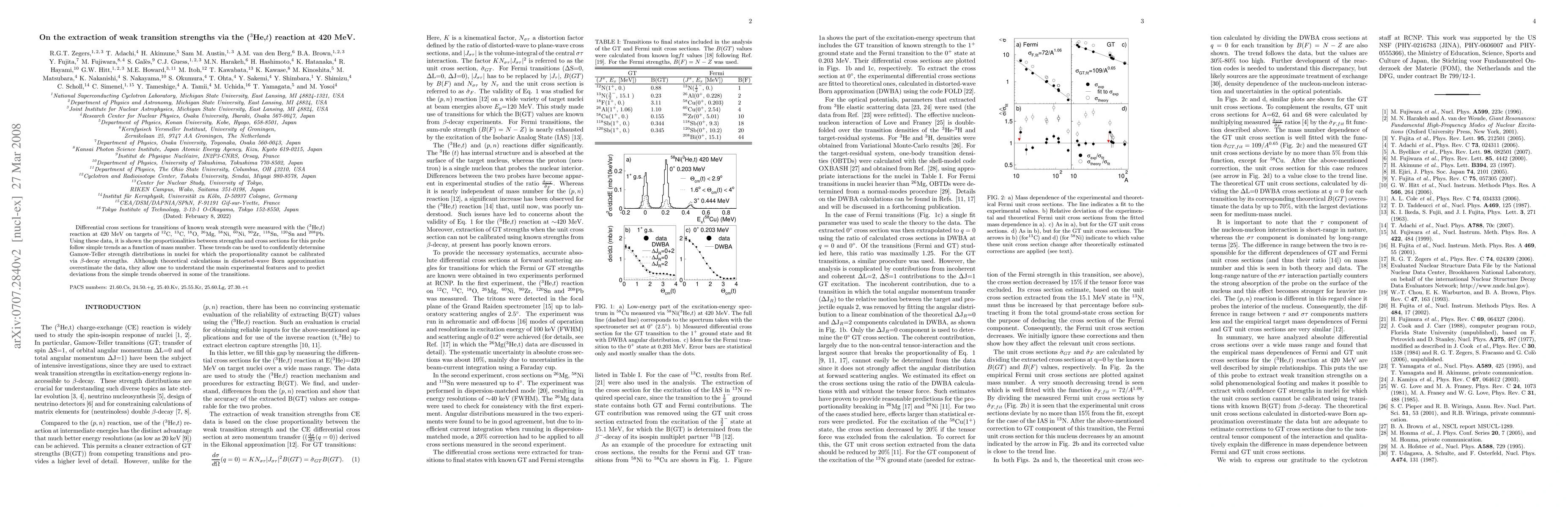 This paper measures differential cross sections for weak transitions using the (3He,t) reaction at 420 MeV on various nuclei, revealing simple trends in proportionalities between transition strengths and cross sections. These trends enable the determination of Gamow-Teller strength distributions in uncalibrated nuclei, despite theoretical calculations overestimating the data.