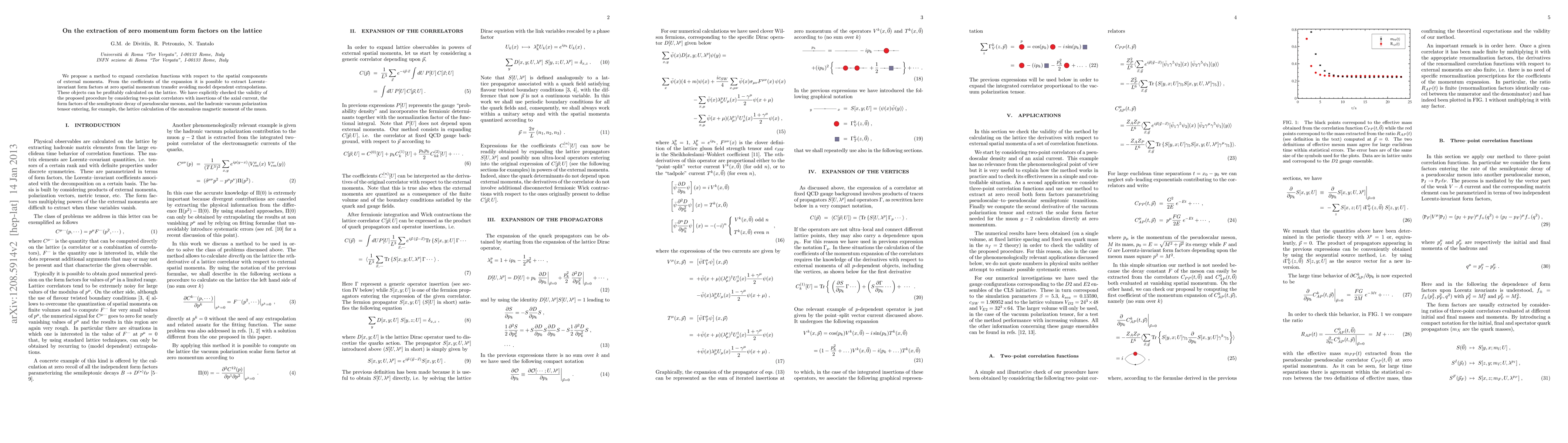 This paper proposes a novel method to extract zero momentum form factors on the lattice by expanding correlation functions in terms of spatial momentum components, thereby avoiding model-dependent extrapolations. The method's validity is demonstrated through calculations involving axial current form factors and the hadronic vacuum polarization tensor.