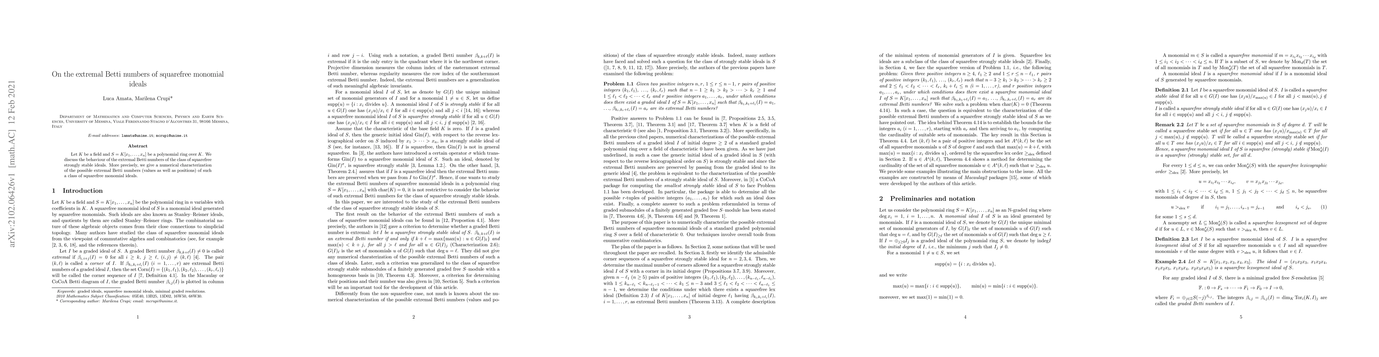 This paper characterizes the extremal Betti numbers of squarefree strongly stable monomial ideals in polynomial rings, providing numerical insights into their values and positions. The study focuses on the behavior of these extremal Betti numbers within the specific class of squarefree monomial ideals.