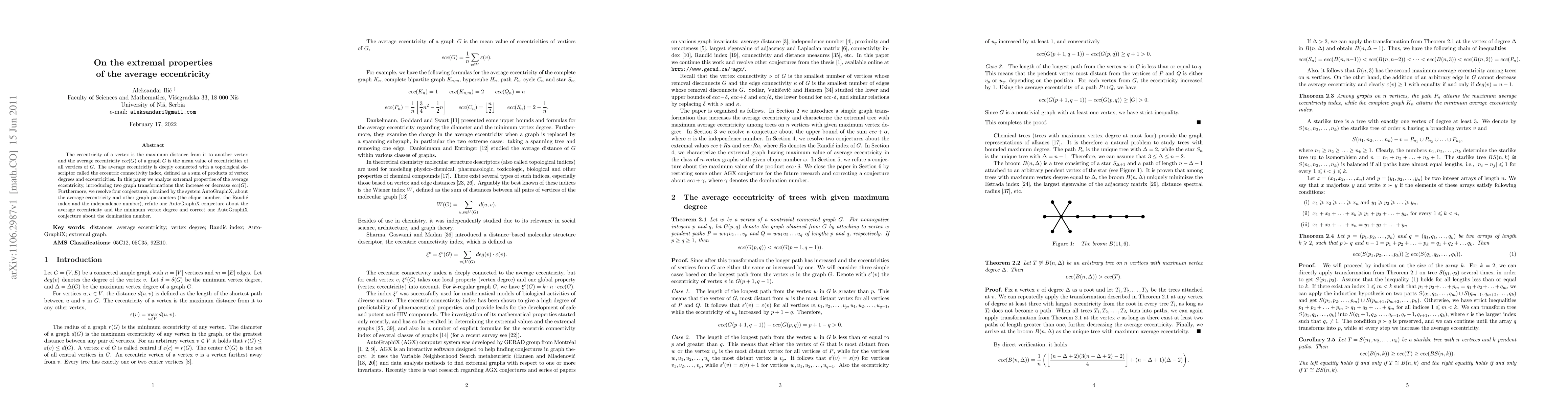 The eccentricity of a vertex is the maximum distance from it to another vertex and the average eccentricity $ecc (G)$ of a graph $G$ is the mean value of eccentricities of all vertices of $G$. The average eccentricity is deeply connected with a topological descriptor called the eccentric connectivity index, defined as a sum of products of vertex degrees and eccentricities. In this paper we analyze extremal properties of the average eccentricity, introducing two graph transformations that increase or decrease $ecc (G)$. Furthermore, we resolve four conjectures, obtained by the system AutoGraphiX, about the average eccentricity and other graph parameters (the clique number, the Randi\' c index and the independence number), refute one AutoGraphiX conjecture about the average eccentricity and the minimum vertex degree and correct one AutoGraphiX conjecture about the domination number.