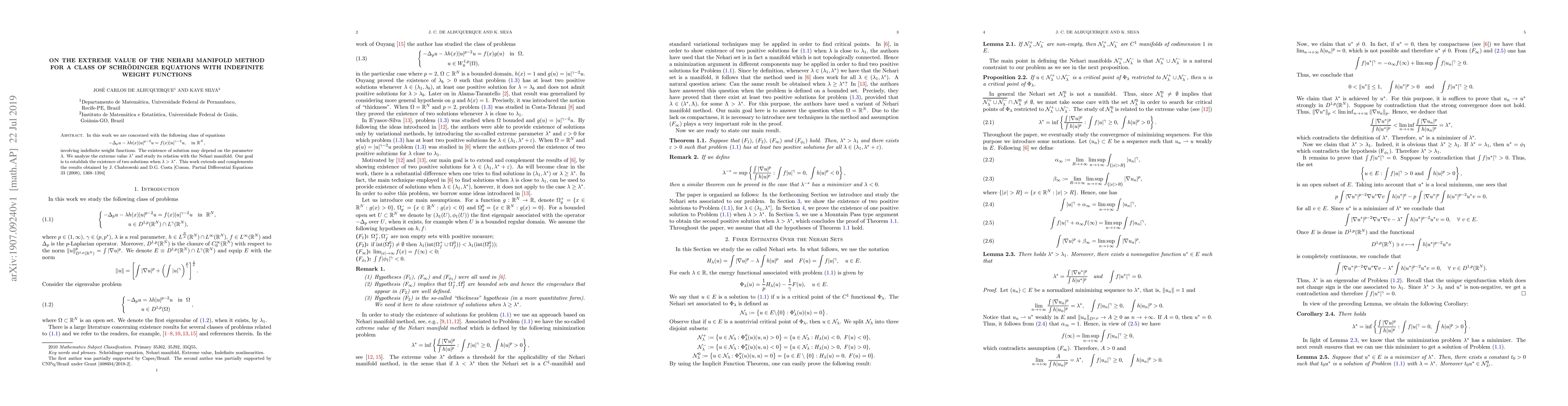 Summary: This paper investigates the existence of solutions for a class of Schrödinger equations with indefinite weight functions, focusing on the extreme value λ* of the Nehari manifold method. The study establishes the existence of two solutions when λ exceeds λ*, extending previous results by Chabrowski and Costa.