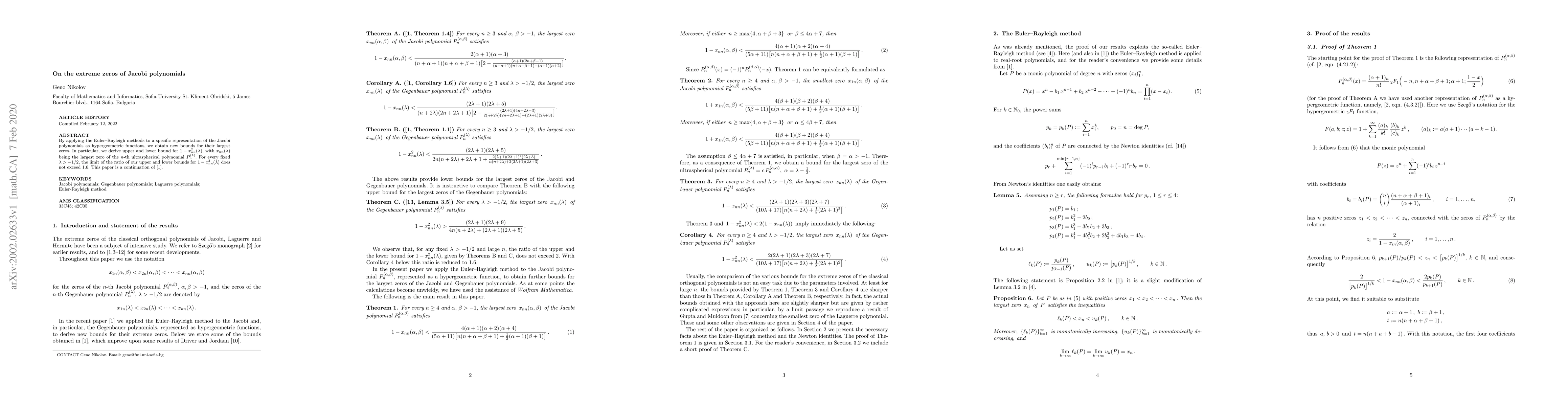 Title: On the extreme zeros of Jacobi polynomials Summary: This paper applies Euler-Rayleigh methods to Jacobi polynomials expressed as hypergeometric functions to derive new bounds for their largest zeros, specifically showing that the ratio of upper and lower bounds for $1-x_{nn}^2(\lambda)$ does not exceed 1.6 for any $\lambda > -1/2$.