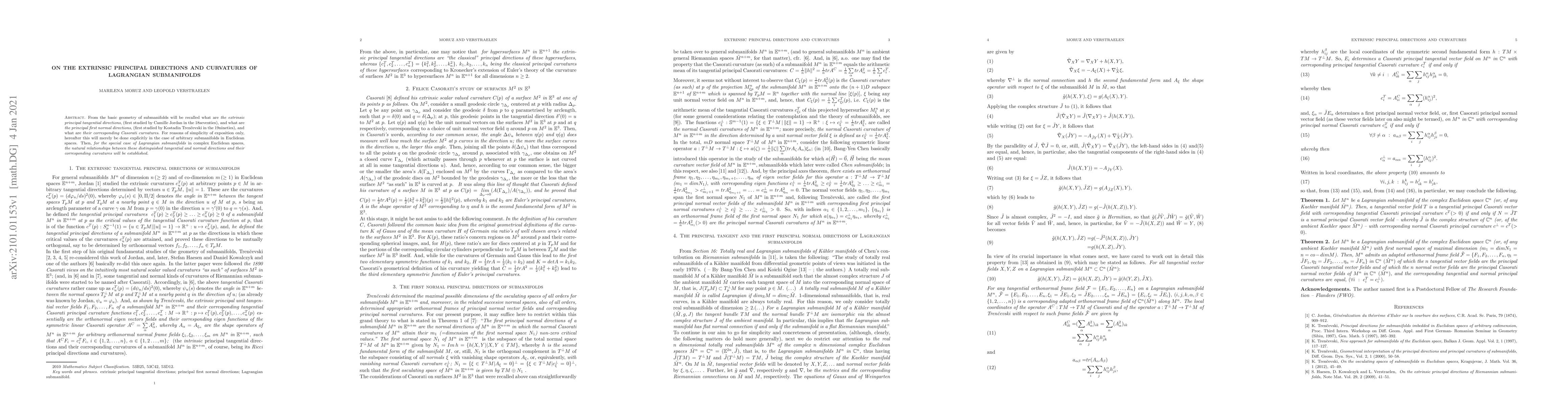 From the basic geometry of submanifolds will be recalled what are the extrinsic principal tangential directions, (first studied by Camille Jordan in the $18$seventies), and what are the principal first normal directions, (first studied by Kostadin Trencevski in the $19$nineties), and what are their corresponding Casorati curvatures. For reasons of simplicity of exposition only, hereafter this will merely be done explicitly in the case of arbitrary submanifolds in Euclidean spaces. Then, for the special case of Lagrangian submanifolds in complex Euclidean spaces, the natural relationships between these distinguished tangential and normal directions and their corresponding curvatures will be established.