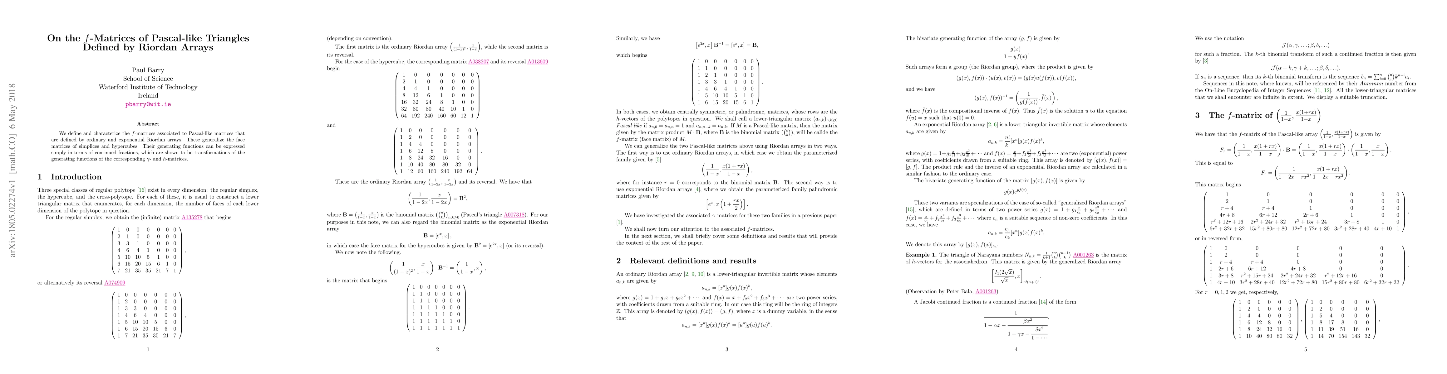 This paper defines and characterizes the $f$-matrices linked to Pascal-like matrices derived from ordinary and exponential Riordan arrays, generalizing the face matrices of simplices and hypercubes. The generating functions for these matrices are expressed through continued fractions, which are transformations of the generating functions of $\gamma$- and $h$-matrices.