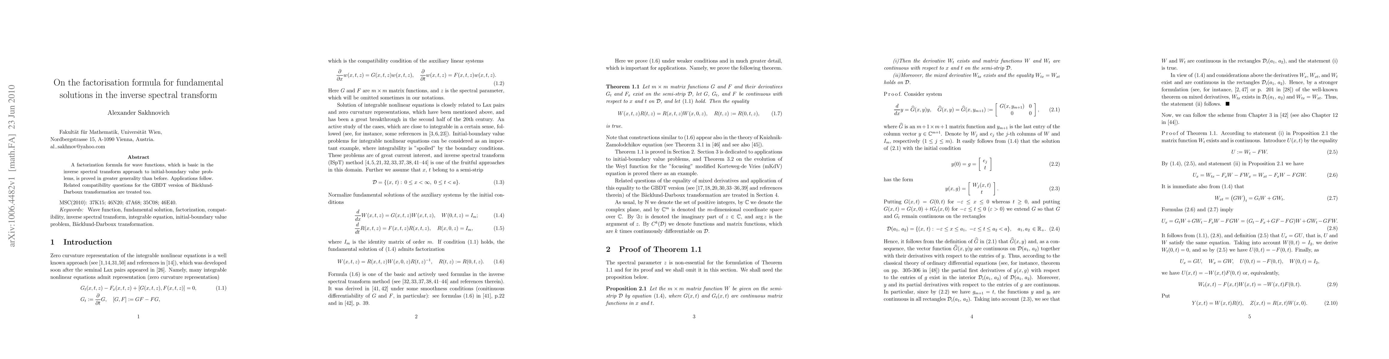 A factorization formula for wave functions, which is basic in the inverse spectral transform approach to initial-boundary value problems, is proved in greater generality than before. Applications follow. Related compatibility questions for the GBDT version of B\"acklund-Darboux transformation are treated too.