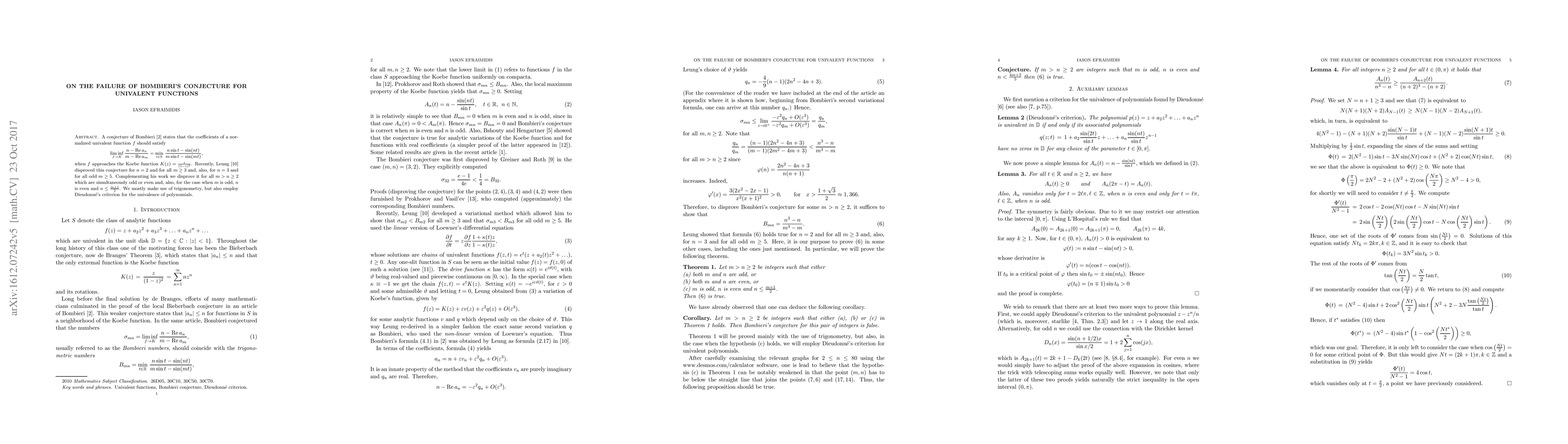 A conjecture of Bombieri states that the coefficients of a normalized univalent function $f$ should satisfy $$ \liminf_{f\to K} \frac{n-{\rm Re\,}a_n}{m-{\rm Re\,}a_m} = \min_{t\in{\mathbb R}} \, \frac{n\sin t -\sin(nt)}{m\sin t -\sin(mt)}, $$ when $f$ approaches the Koebe function $K(z)=\frac{z}{(1-z)^2}$. Recently, Leung disproved this conjecture for $n=2$ and for all $m\geq3$ and, also, for $n=3$ and for all odd $m\geq5$. Complementing his work we disprove it for all $m>n\geq2$ which are simultaneously odd or even and, also, for the case when $m$ is odd, $n$ is even and $n\leq \frac{m+1}{2}$. We mostly make use of trigonometry, but also employ Dieudonn\'e's criterion for the univalence of polynomials.