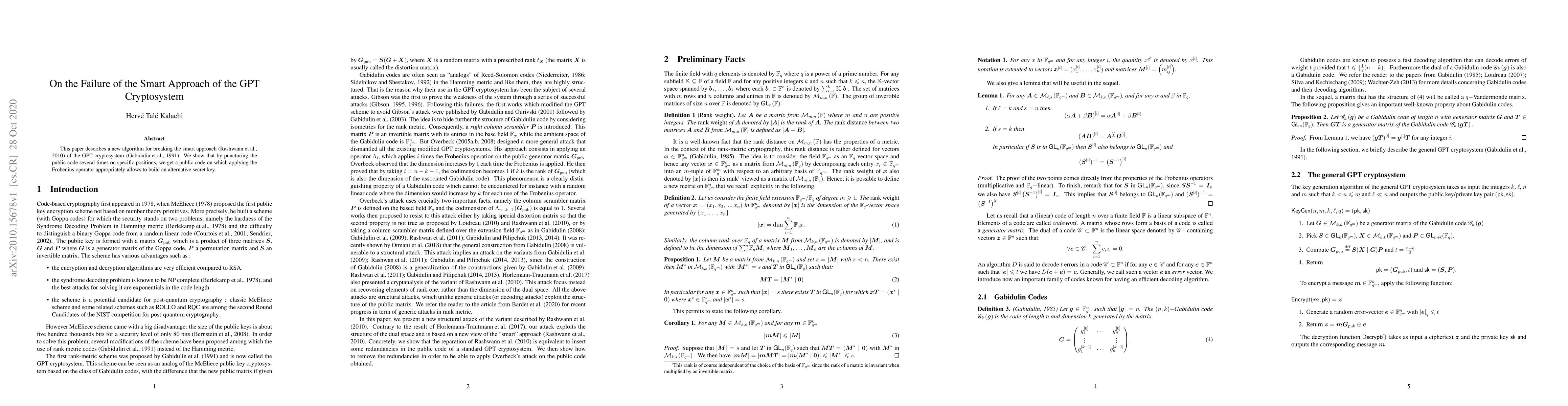 This paper presents a novel algorithm to break the smart approach of the GPT cryptosystem by puncturing the public code at specific positions, enabling the construction of an alternative secret key via the Frobenius operator.