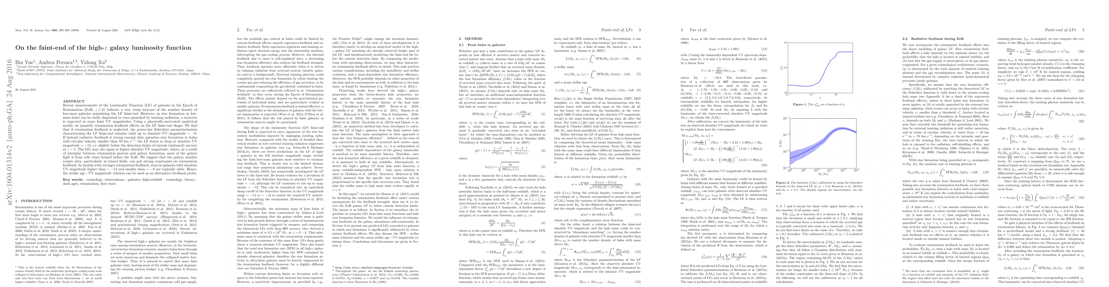 This paper investigates the shape of the galaxy luminosity function at high redshifts, focusing on the faint-end where low-mass galaxies reside. It finds that reionization feedback can significantly alter the faint-end shape, potentially causing a turnover at faint UV magnitudes, and suggests that galaxy number counts and stellar age-UV magnitude relations can provide insights into these feedback effects.