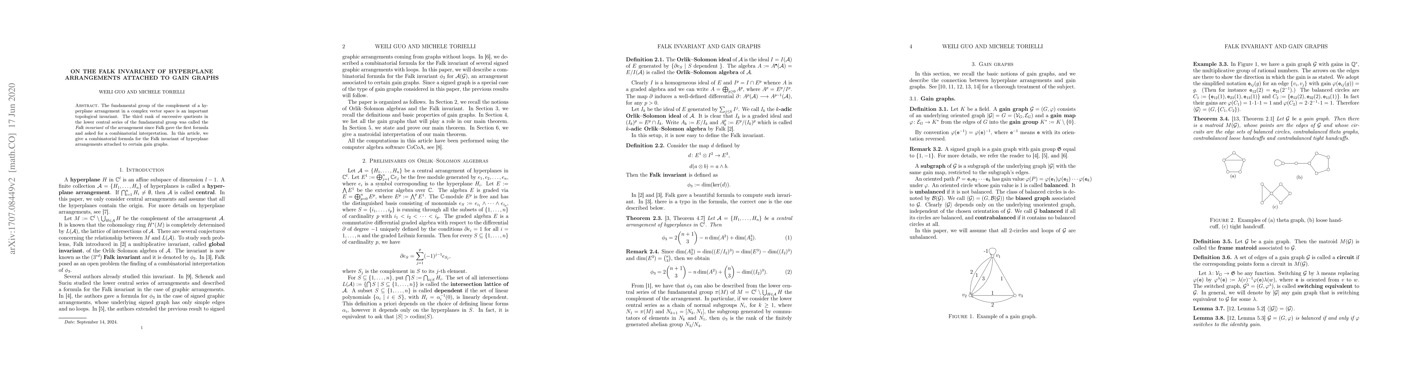 Summary: This paper provides a combinatorial formula for the Falk invariant, a topological invariant of hyperplane arrangements, specifically for arrangements linked to certain gain graphs. The authors aim to interpret this invariant in combinatorial terms.