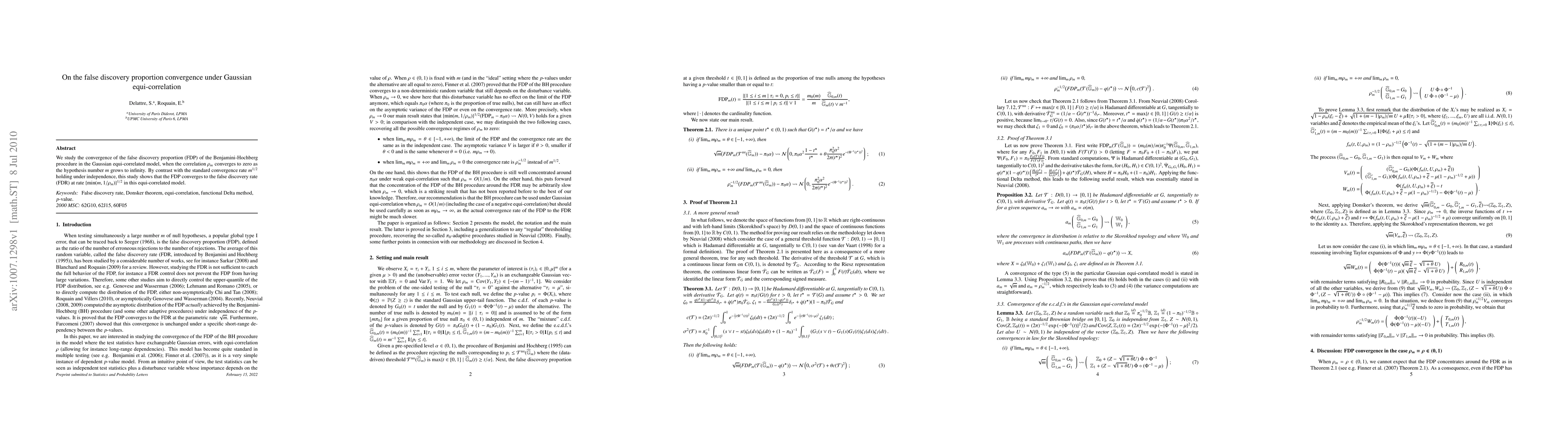This paper investigates the convergence rate of the false discovery proportion (FDP) in the Benjamini-Hochberg procedure under Gaussian equi-correlation, showing that it converges to the false discovery rate (FDR) at a rate of $\{\min(m,1/\rho_m)\}^{1/2}$ as correlation diminishes, differing from the $m^{1/2}$ rate under independence.