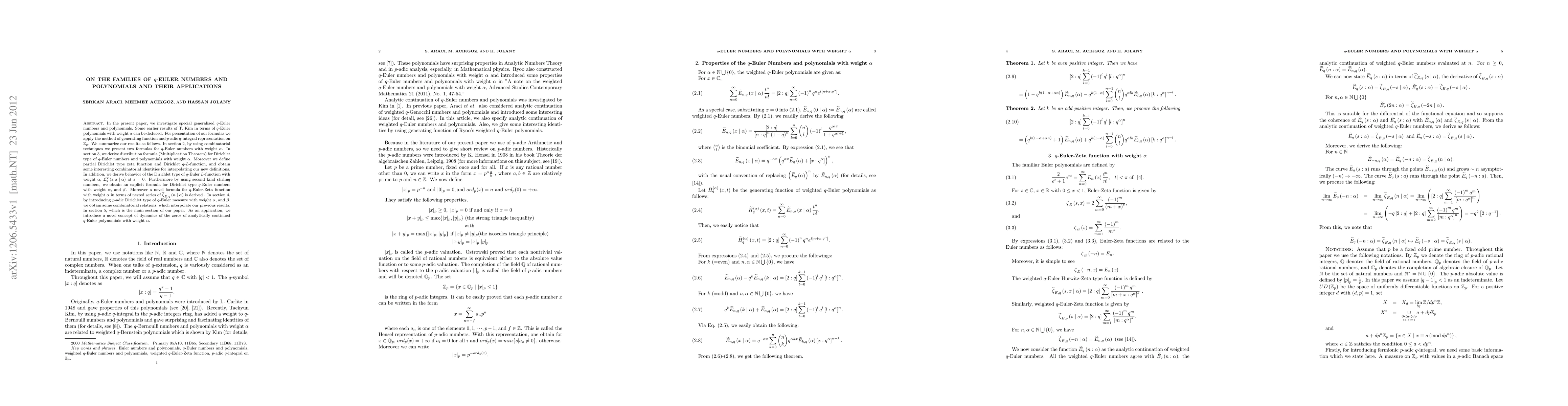 In the present paper, we investigate special generalized q-Euler numbers and polynomials. Some earlier results of T. Kim in terms of q-Euler polynomials with weight alpha can be deduced. For presentation of our formulas we apply the method of generating function and p-adic q-integral representation on Zp. We summarize our results as follows. In section 2, by using combinatorial techniques we present two formulas for q-Euler numbers with weight alpha. In section 3, we derive distribution formula (Multiplication Theorem) for Dirichlet type of q-Euler numbers and polynomials with weight . Moreover we define partial Dirichlet type zeta function and Dirichlet q-L-function, and obtain some interesting combinatorial identities for interpolating our new definitions. In addition, we derive behavior of the Dirichlet type of q-Euler L-function with weight alpha, Lq (s; x j) at s = 0. Furthermore by using second kind stirling numbers, we obtain an explicit formula for Dirichlet type q-Euler numbers with weight alpha. Moreover a novel formula for q-Euler-Zeta function with weight in terms of nested series of E;q (n j) is derived . In section 4, by introducing p-adic Dirichlet type of q-Euler measure with weight, and we obtain some combinatorial relations, which interpolate our previous results. In section 5, which is the main section of our paper. As an application, we introduce a novel concept of dynamics of the zeros of analytically continued q-Euler polynomials with weight alpha.