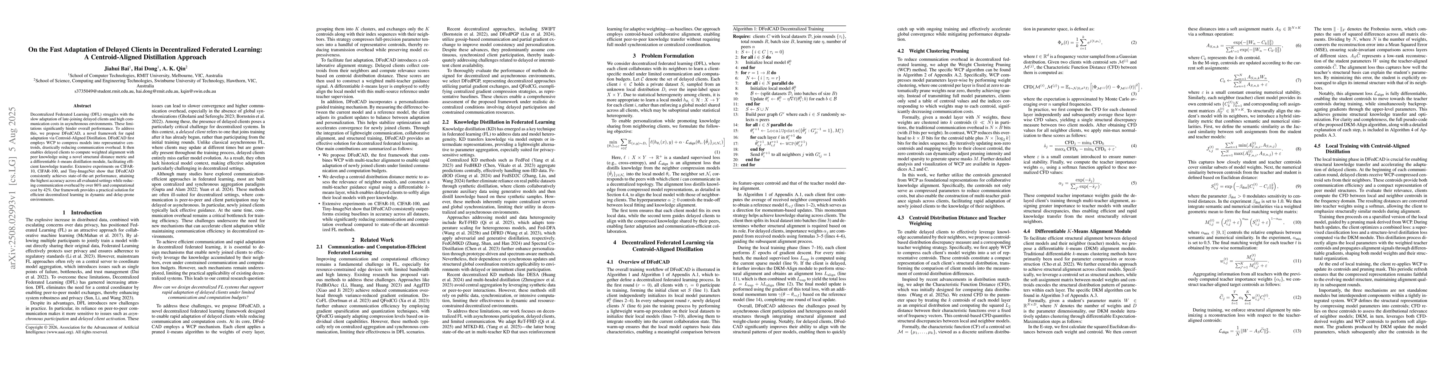 Decentralized Federated Learning (DFL) struggles with the slow adaptation of late-joining delayed clients and high communication costs in asynchronous environments. These limitations significantly hinder overall performance. To address this, we propose DFedCAD, a novel framework for rapid adaptation via Centroid-Aligned Distillation. DFedCAD first employs Weighted Cluster Pruning (WCP) to compress models into representative centroids, drastically reducing communication overhead. It then enables delayed clients to intelligently weigh and align with peer knowledge using a novel structural distance metric and a differentiable k-means distillation module, facilitating efficient end-to-end knowledge transfer. Extensive experiments on CIFAR-10, CIFAR-100, and Tiny-ImageNet show that DFedCAD consistently achieves state-of-the-art performance, attaining the highest accuracy across all evaluated settings while reducing communication overhead by over 86%. Our framework provides a scalable and practical solution for efficient decentralized learning in dynamic, real-world scenarios.
