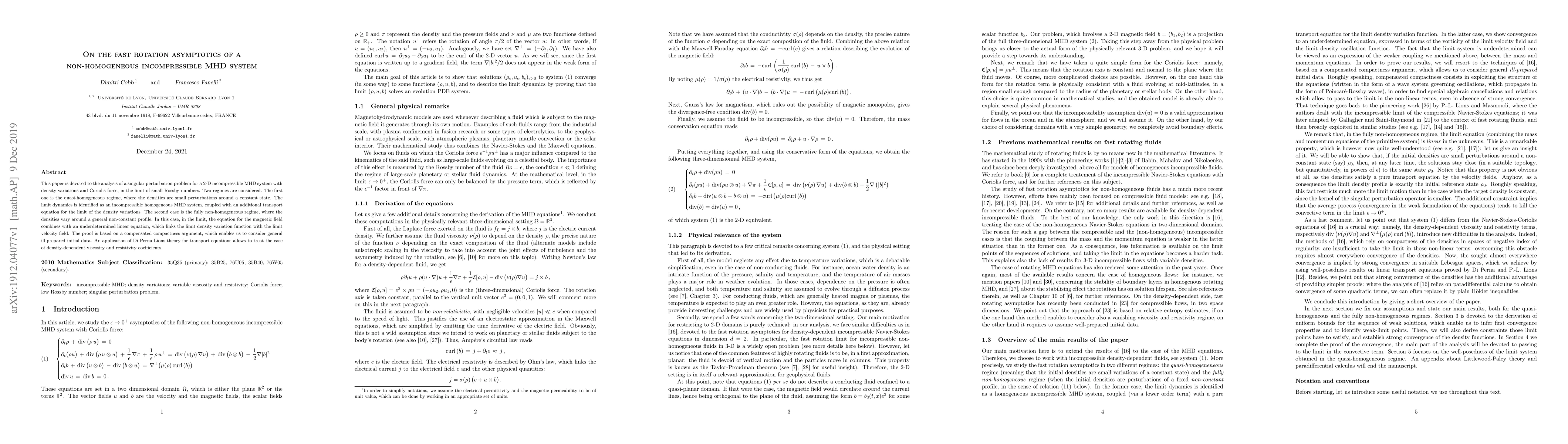 This paper analyzes the asymptotic behavior of a 2-D incompressible MHD system with density variations and Coriolis force under fast rotation, identifying limit dynamics in quasi-homogeneous and fully non-homogeneous regimes using a compensated compactness argument and Di Perna-Lions theory.