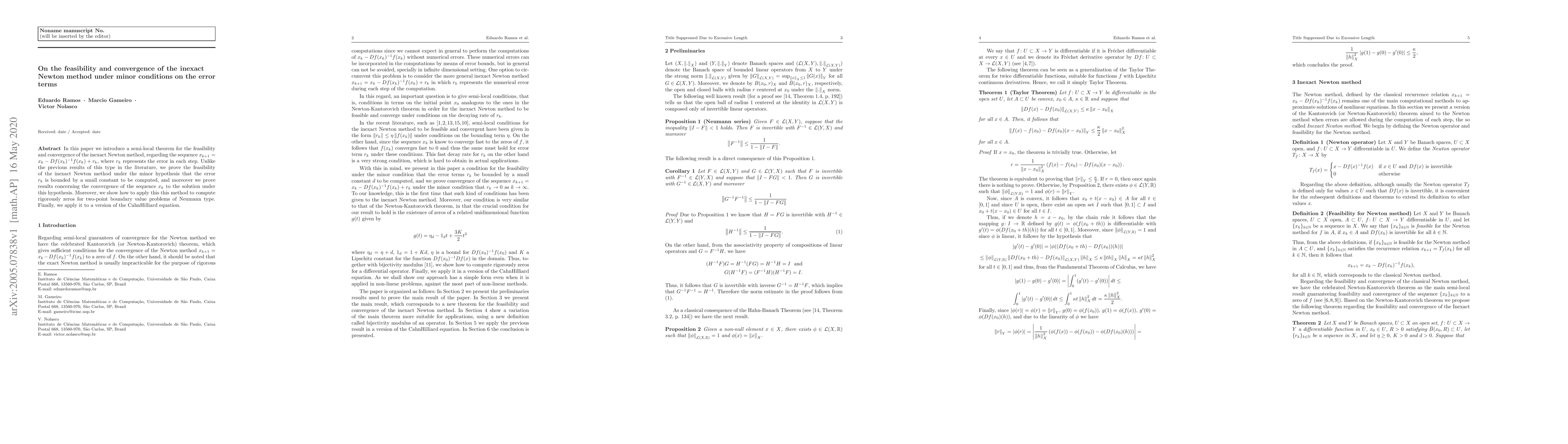 This paper presents a semi-local theorem for the feasibility and convergence of the inexact Newton method under minimal conditions on the error terms, proving convergence when the error is bounded by a small constant. It also demonstrates applications to solving two-point boundary value problems and the Cahn-Hilliard equation.