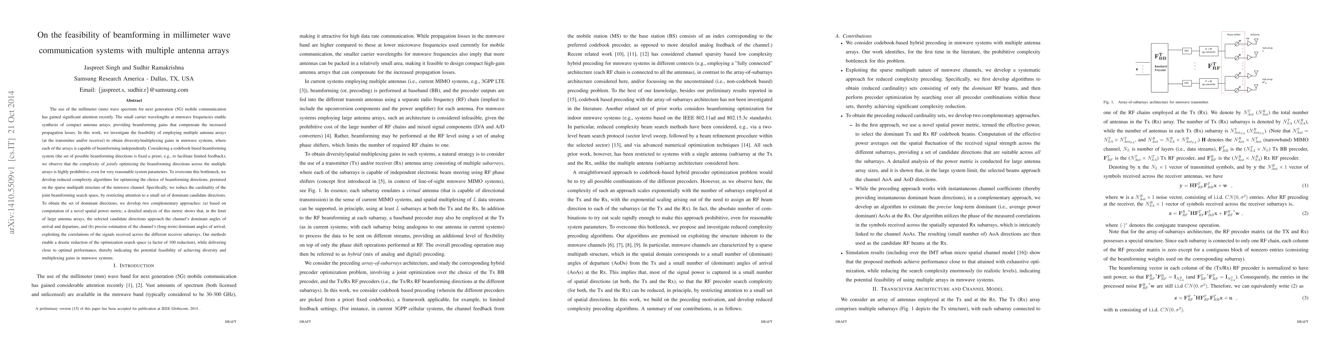This paper explores the feasibility of using multiple antenna arrays for beamforming in millimeter wave communication systems to achieve diversity and multiplexing gains. It develops reduced complexity algorithms to optimize beamforming directions, focusing on dominant candidate directions, and demonstrates a significant reduction in optimization complexity while maintaining near-optimal performance.