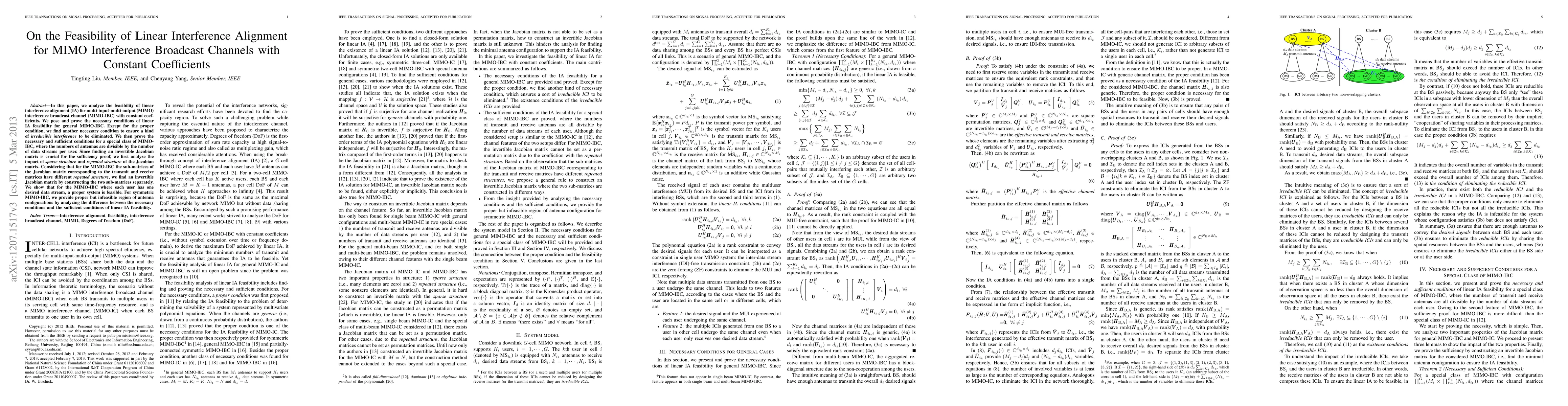 In this paper, we analyze the feasibility of linear interference alignment (IA) for multi-input-multi-output (MIMO) interference broadcast channel (MIMO-IBC) with constant coefficients. We pose and prove the necessary conditions of linear IA feasibility for general MIMO-IBC. Except for the proper condition, we find another necessary condition to ensure a kind of irreducible interference to be eliminated. We then prove the necessary and sufficient conditions for a special class of MIMO-IBC, where the numbers of antennas are divisible by the number of data streams per user. Since finding an invertible Jacobian matrix is crucial for the sufficiency proof, we first analyze the impact of sparse structure and repeated structure of the Jacobian matrix. Considering that for the MIMO-IBC the sub-matrices of the Jacobian matrix corresponding to the transmit and receive matrices have different repeated structure, we find an invertible Jacobian matrix by constructing the two sub-matrices separately. We show that for the MIMO-IBC where each user has one desired data stream, a proper system is feasible. For symmetric MIMO-IBC, we provide proper but infeasible region of antenna configurations by analyzing the difference between the necessary conditions and the sufficient conditions of linear IA feasibility.