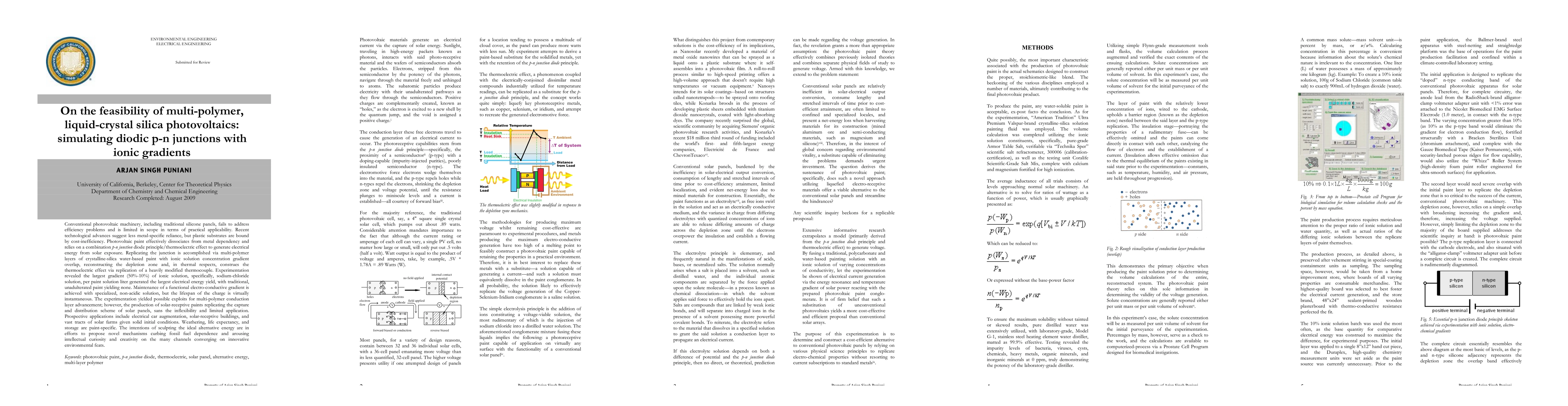Conventional photovoltaic machinery, including traditional silicone panels, fails to address efficiency problems. Recent technological advances suggest less metal-specific reliance, but plastic substrates are bound by cost-inefficiency. Photovoltaic paint effectively dissociates from metal dependency and relies on a combination p-n junction diode principle/thermoelectric effect to generate electrical energy from solar exposure. Replicating the junction is accomplished via multi-polymer layers of crystalline-silica water-based paint with ionic solution concentration gradient overlap, reconstructing the depletion zone and, in thermal respects, construes the thermoelectric effect via replication of a heavily modified thermocouple. Experimentation revealed the largest gradient (50%-10%) of ionic solution, specifically, sodium-chloride solution, per paint solution liter generated the largest electrical energy yield (Cf. control yielding none). Maintenance of a functional electro-conductive gradient is achieved with specialized, non-acidic solution, but the lifespan of the charge is virtually instantaneous. The experimentation yielded possible exploits for multi-polymer conduction layer advancement; however, the production of solar-receptive paints replicating the capture and distribution scheme of solar panels, sans the inflexibility and limited application. Prospective applications include electrical automobile augmentation, solar-receptive buildings, and vast tracts of solar farms given solid initial conditions. Weathering, life expectancy, and storage are paint-specific. The intentions of sculpting the ideal alternative energy are in efforts to propose novel mechanisms curbing fossil fuel dependence and arousing intellectual curiosity and creativity on the many channels converging on innovative environmental feats.