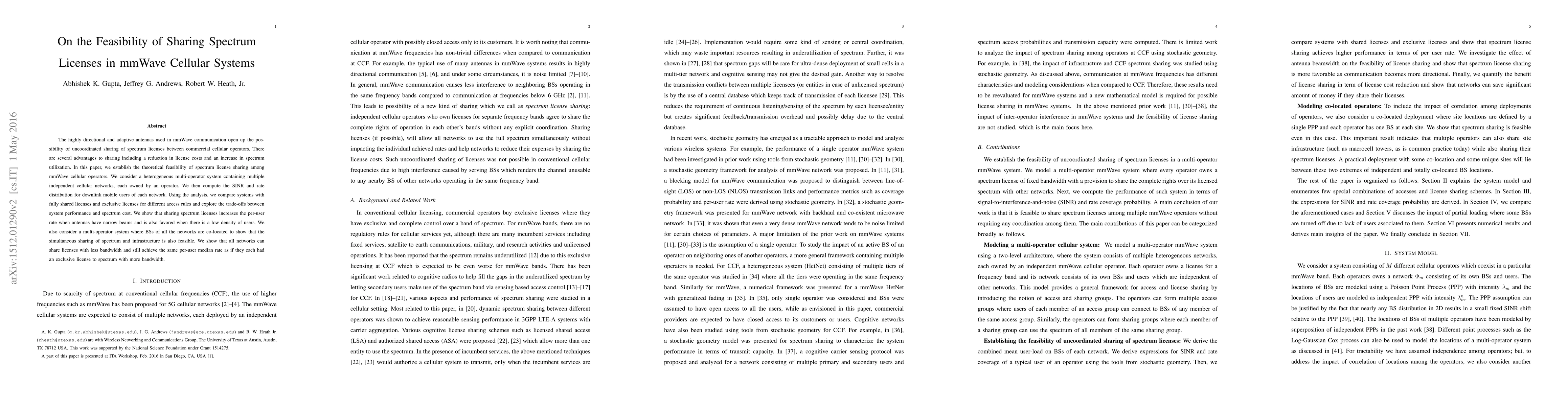 This paper explores the theoretical feasibility of sharing spectrum licenses among mmWave cellular operators using directional antennas, demonstrating increased per-user rates and spectrum efficiency, particularly in low-density user scenarios. It also shows that co-located base stations can share both spectrum and infrastructure effectively.