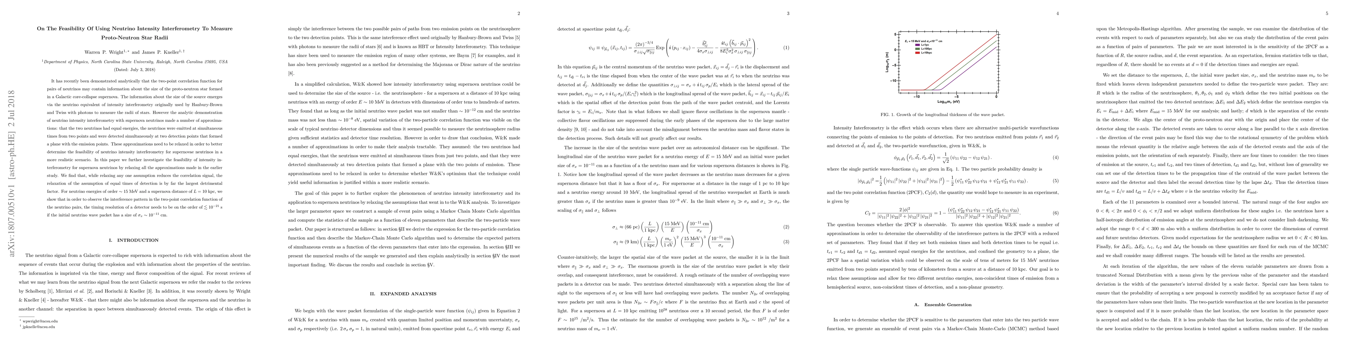It has recently been demonstrated analytically that the two-point correlation function for pairs of neutrinos may contain information about the size of the proto-neutron star formed in a Galactic core-collapse supernova. The information about the size of the source emerges via the neutrino equivalent of intensity interferometry originally used by Hanbury-Brown and Twiss with photons to measure the radii of stars. However the analytic demonstration of neutrino intensity interferometry with supernova neutrinos made a number of approximations: that the two neutrinos had equal energies, the neutrinos were emitted at simultaneous times from two points and were detected simultaneously at two detection points that formed a plane with the emission points. These approximations need to be relaxed in order to better determine the feasibility of neutrino intensity interferometry for supernovae neutrinos in a more realistic scenario. In this paper we further investigate the feasibility of intensity interferometry for supernova neutrinos by relaxing all the approximations made in the earlier study. We find that, while relaxing any one assumption reduces the correlation signal, the relaxation of the assumption of equal times of detection is by far the largest detrimental factor. For neutrino energies of order $\sim$15 MeV and a supernova distance of L = 10 kpc, we show that in order to observe the interference pattern in the two-point correlation function of the neutrino pairs, the timing resolution of a detector needs to be on the order of $\lesssim 10^{-21}\;{\rm s}$ if the initial neutrino wave packet has a size of $\sigma_x \sim 10^{-11}\;{\rm cm}$.