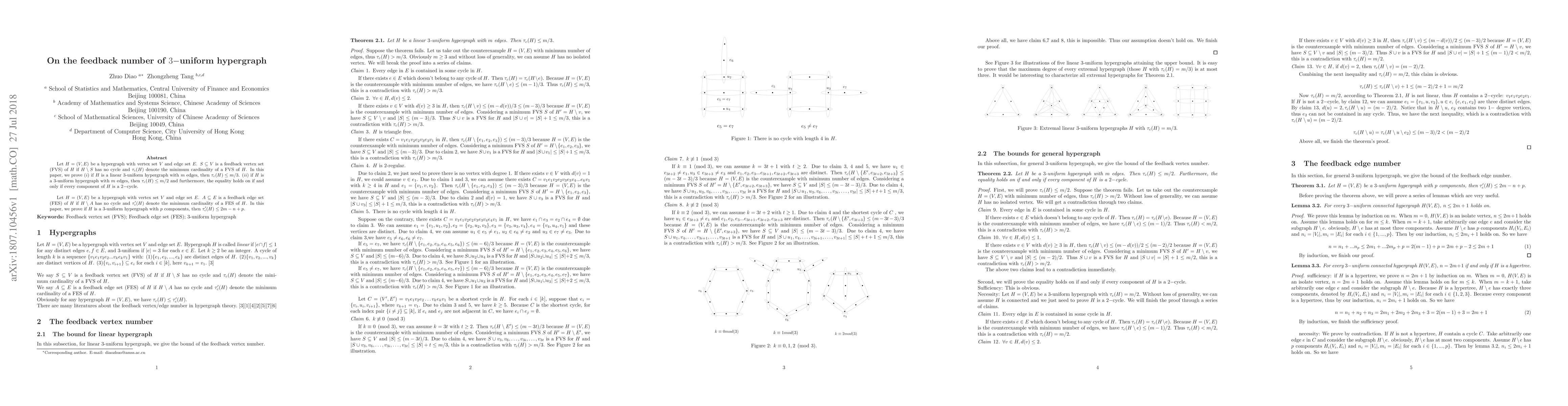 Let $H=(V,E)$ be a hypergraph with vertex set $V$ and edge set $E$. $S\subseteq V$ is a feedback vertex set (FVS) of $H$ if $H\setminus S$ has no cycle and $\tau_c(H)$ denote the minimum cardinality of a FVS of $H$. In this paper, we prove $(i)$ if $H$ is a linear $3$-uniform hypergraph with $m$ edges, then $\tau_c(H)\le m/3$. $(ii)$ if $H$ is a $3$-uniform hypergraph with $m$ edges, then $\tau_c(H)\le m/2$ and furthermore, the equality holds on if and only if every component of $H$ is a $2-$cycle. Let $H=(V,E)$ be a hypergraph with vertex set $V$ and edge set $E$. $A\subseteq E$ is a feedback edge set (FES) of $H$ if $H\setminus A$ has no cycle and $\tau_c'(H)$ denote the minimum cardinality of a FES of $H$. In this paper, we prove if $H$ is a $3$-uniform hypergraph with $p$ components, then $\tau_c'(H)\le 2m-n+p$.
