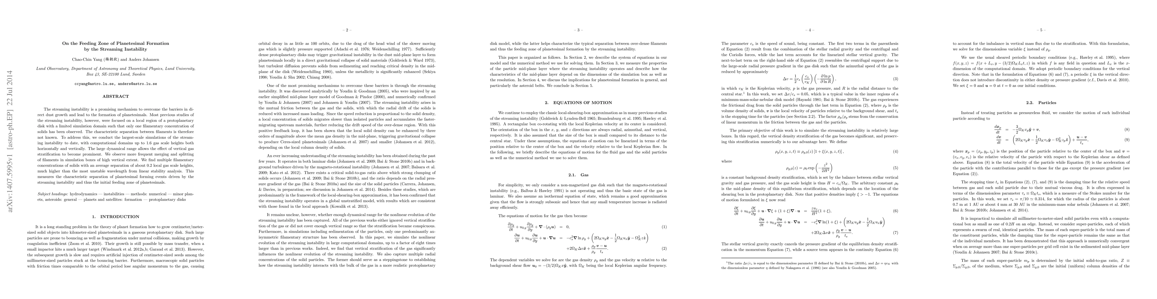 This paper investigates the streaming instability mechanism for planetesimal formation using large-scale simulations, revealing multiple filamentary concentrations of solids with an average separation of 0.2 local gas scale heights, providing insight into the initial feeding zone for planetesimal formation.