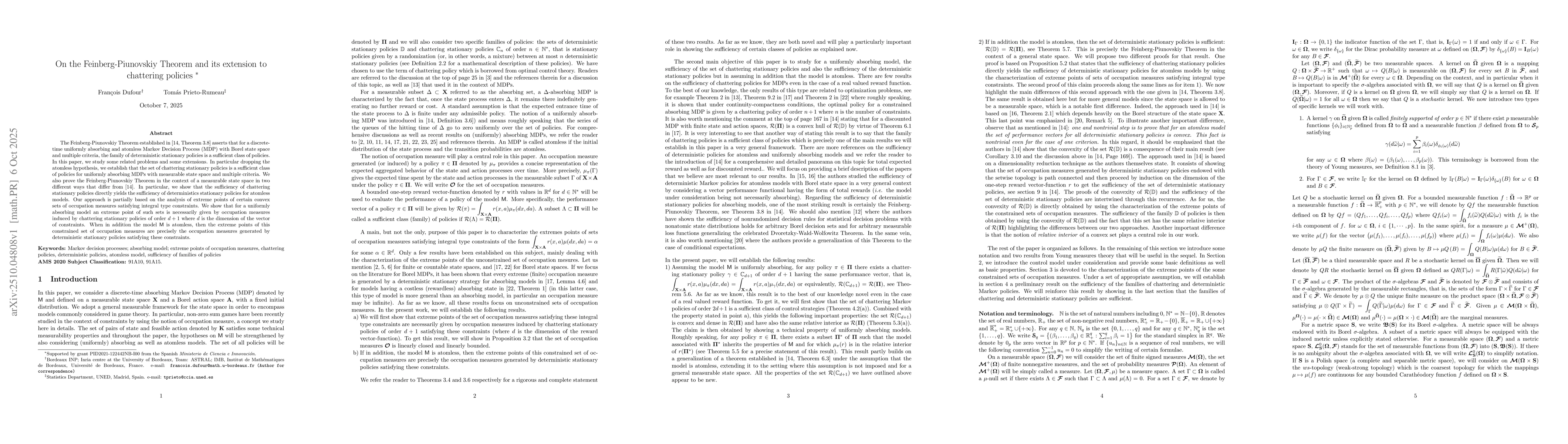 The Feinberg-Piunovskiy Theorem established in [14, Theorem 3.8] asserts that for a discrete-time uniformly absorbing and atomless Markov Decision Process (MDP) with Borel state space and multiple criteria, the family of deterministic stationary policies is a sufficient class of policies. In this paper, we study some related problems and some extensions. In particular dropping the atomless hypothesis, we establish that the set of chattering stationary policies is a sufficient class of policies for uniformly absorbing MDPs with measurable state space and multiple criteria. We also prove the Feinberg-Piunovskiy Theorem in the context of a measurable state space in two different ways that differ from \cite{piunovskiy19}. In particular, we show that the sufficiency of chattering stationary policies directly yields the sufficiency of deterministics stationary policies for atomless models. Our approach is partially based on the analysis of extreme points of certain convex sets of occupation measures satisfying integral type constraints. We show that for a uniformly absorbing model an extreme point of such sets is necessarily given by occupation measures induced by chattering stationary policies of order $d+1$ where $d$ is the dimension of the vector of constraints. When in addition the model $\mathsf{M}$ is atomless, then the extreme points of this constrained set of occupation measures are precisely the occupation measures generated by deterministic stationary policies satisfying these constraints.