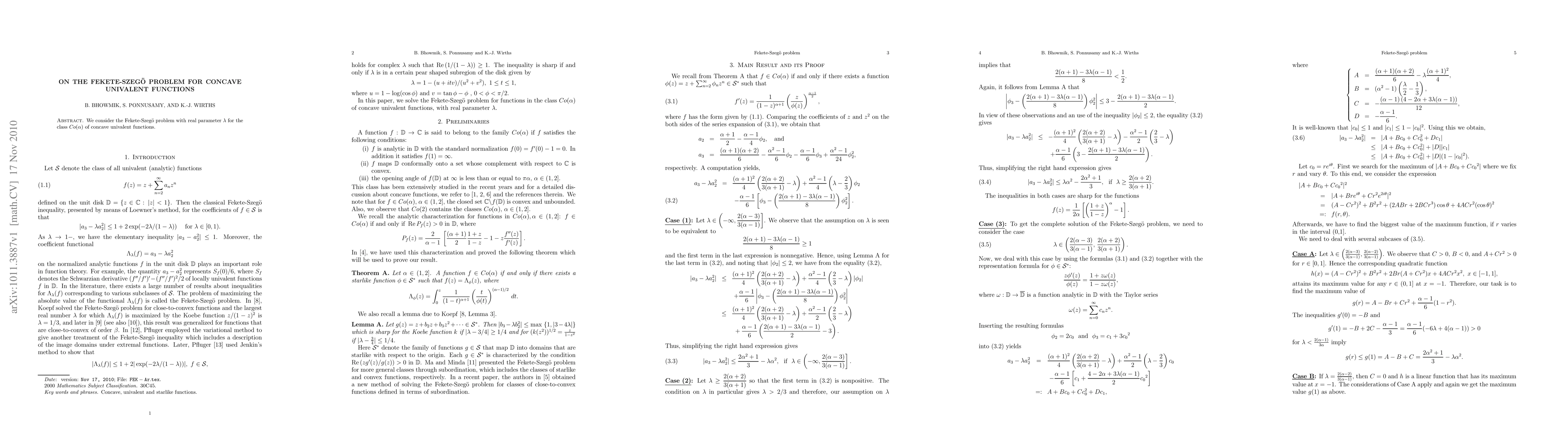 Summary: This paper investigates the Fekete-Szegő problem with a real parameter $\lambda$ for concave univalent functions in the class $Co(\alpha)$, aiming to explore their geometric properties.