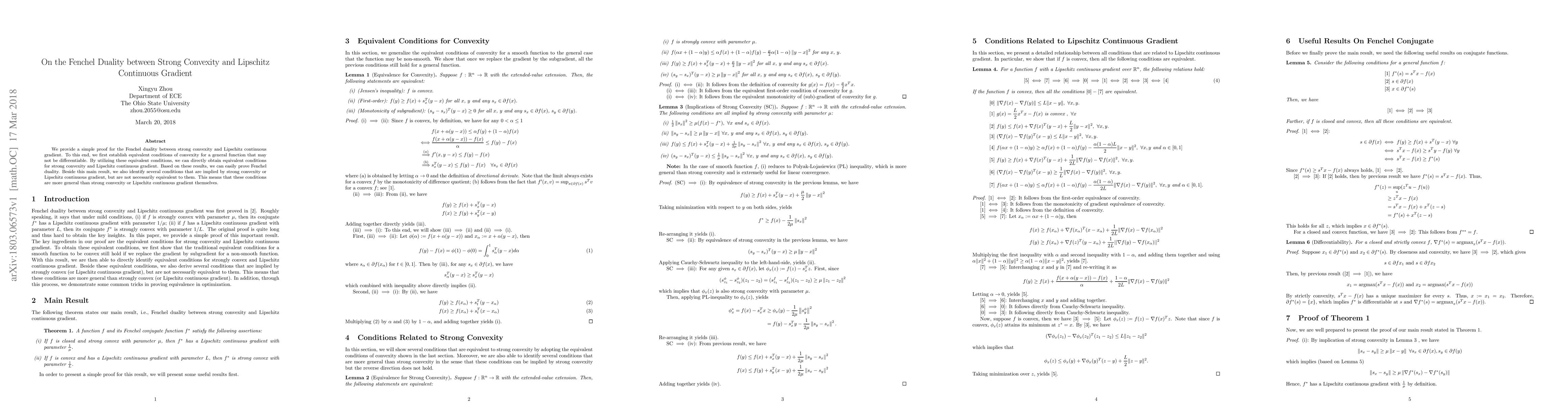 This paper presents a straightforward proof of the Fenchel duality linking strong convexity and Lipschitz continuous gradient. It establishes equivalent conditions for convexity, strong convexity, and Lipschitz continuity, facilitating the proof of the duality and identifying additional general conditions implied by these properties.
