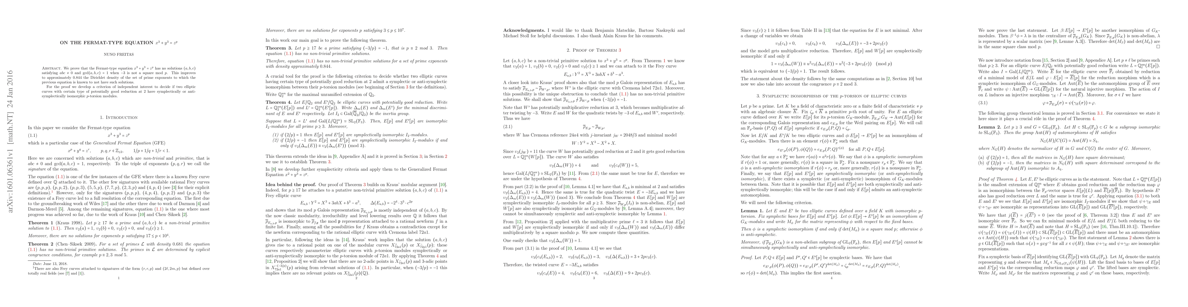 This paper proves that the Fermat-type equation $x^3 + y^3 = z^p$ has no non-trivial integer solutions when $-3$ is not a square mod $p$, improving the known density of prime exponents to approximately $0.844$. The proof utilizes a new criterion for elliptic curve torsion module isomorphism.
