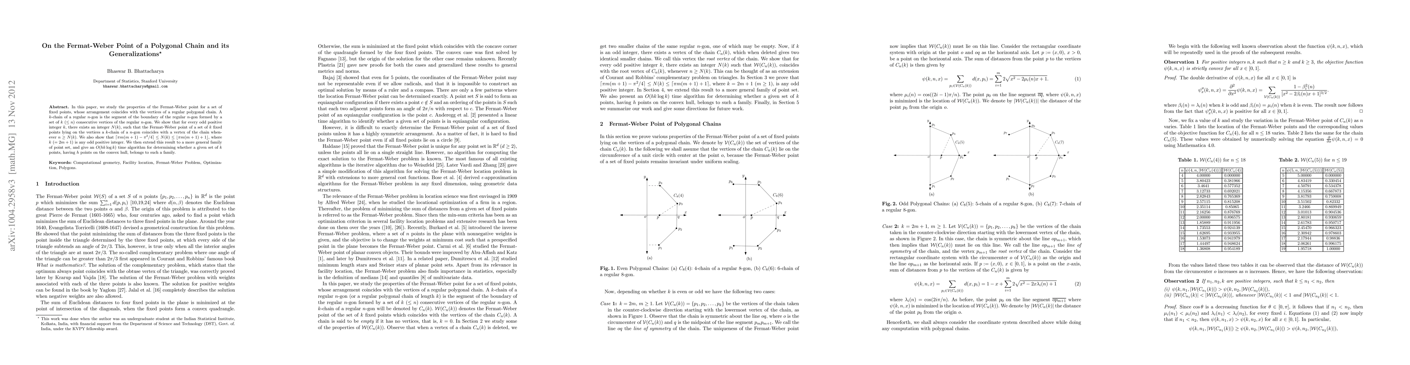This research establishes that for odd-numbered sets of points on a polygonal chain's vertices, there exists a threshold polygon size (N(k)) where the Fermat-Weber point aligns with a chain vertex. It also provides bounds for N(k) and extends the result to a broader point set family, offering an O(hk log k) algorithm to test if a given point set fits this family.