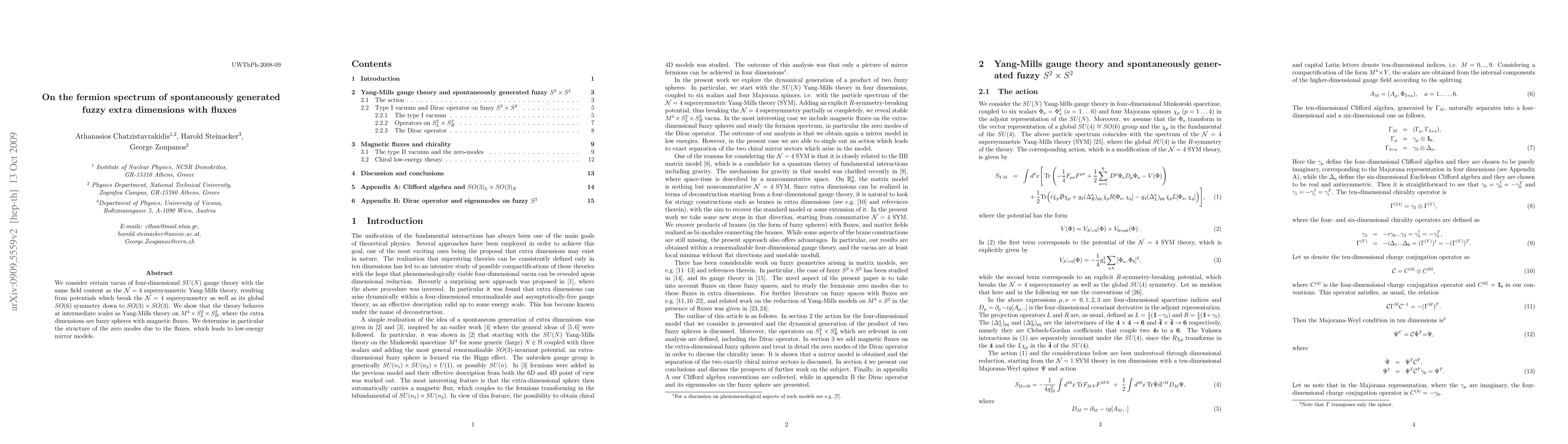 We consider certain vacua of four-dimensional SU(N) gauge theory with the same field content as the N=4 supersymmetric Yang-Mills theory, resulting from potentials which break the N=4 supersymmetry as well as its global SO(6) symmetry down to SO(3) x SO(3). We show that the theory behaves at intermediate scales as Yang-Mills theory on M^4 x S^2 x S^2, where the extra dimensions are fuzzy spheres with magnetic fluxes. We determine in particular the structure of the zero modes due to the fluxes, which leads to low-energy mirror models.