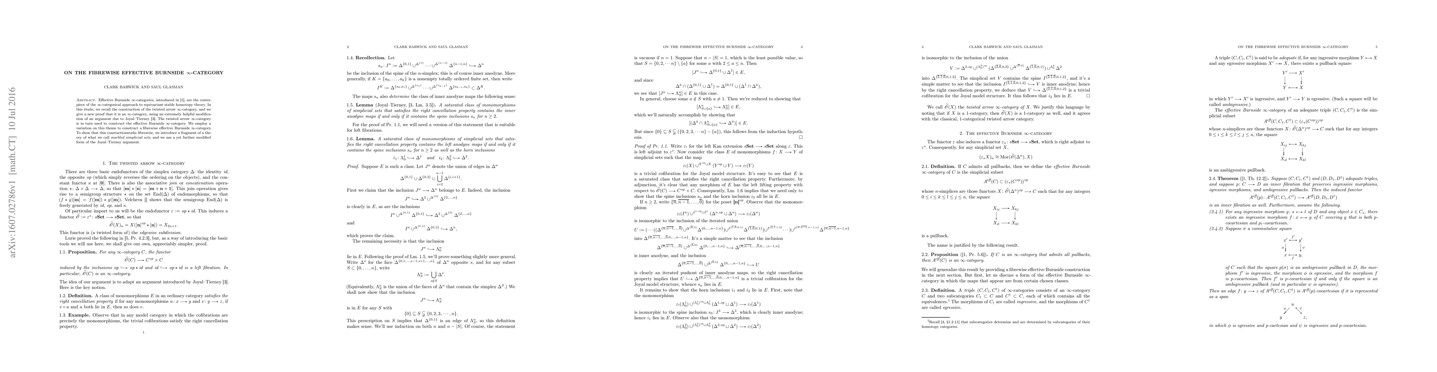 Effective Burnside $\infty$-categories are the centerpiece of the $\infty$-categorical approach to equivariant stable homotopy theory. In this \'etude, we recall the construction of the twisted arrow $\infty$-category, and we give a new proof that it is an $\infty$-category, using an extremely helpful modification of an argument due to Joyal--Tierney. The twisted arrow $\infty$-category is in turn used to construct the effective Burnside $\infty$-category. We employ a variation on this theme to construct a fibrewise effective Burnside $\infty$-category. To show that this constuctionworks fibrewise, we introduce a fragment of a theory of what we call marbled simplicial sets, and we use a yet further modified form of the Joyal--Tierney argument.