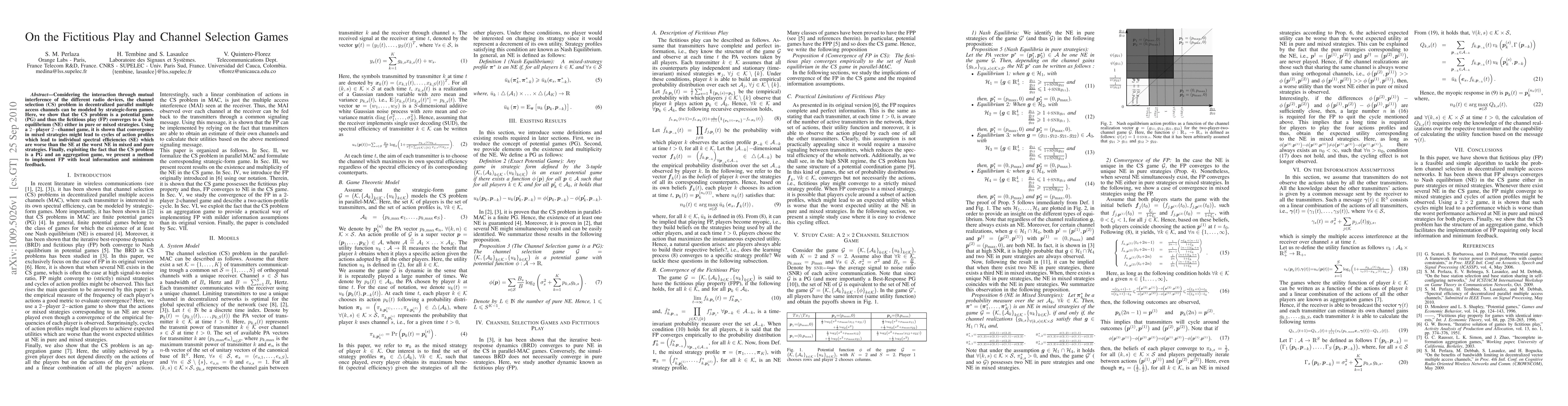 Considering the interaction through mutual interference of the different radio devices, the channel selection (CS) problem in decentralized parallel multiple access channels can be modeled by strategic-form games. Here, we show that the CS problem is a potential game (PG) and thus the fictitious play (FP) converges to a Nash equilibrium (NE) either in pure or mixed strategies. Using a 2-player 2-channel game, it is shown that convergence in mixed strategies might lead to cycles of action profiles which lead to individual spectral efficiencies (SE) which are worse than the SE at the worst NE in mixed and pure strategies. Finally, exploiting the fact that the CS problem is a PG and an aggregation game, we present a method to implement FP with local information and minimum feedback.