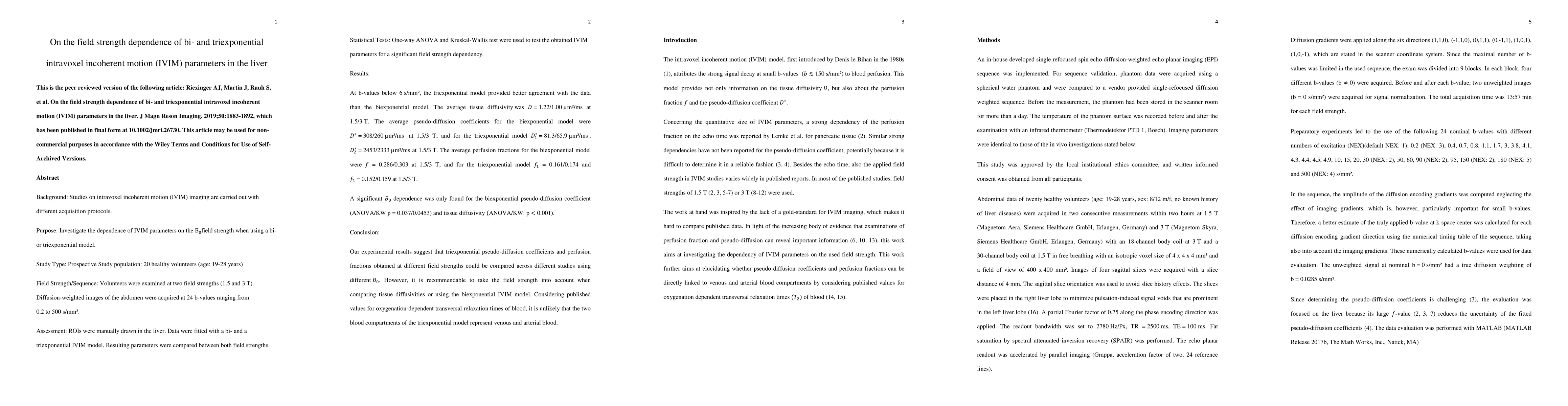 This study investigates the dependence of bi- and triexponential intravoxel incoherent motion (IVIM) parameters in liver tissue on magnetic field strength (1.5T vs. 3T). Results show that triexponential parameters are more robust across field strengths, while biexponential pseudo-diffusion and tissue diffusivity exhibit significant field strength dependence.