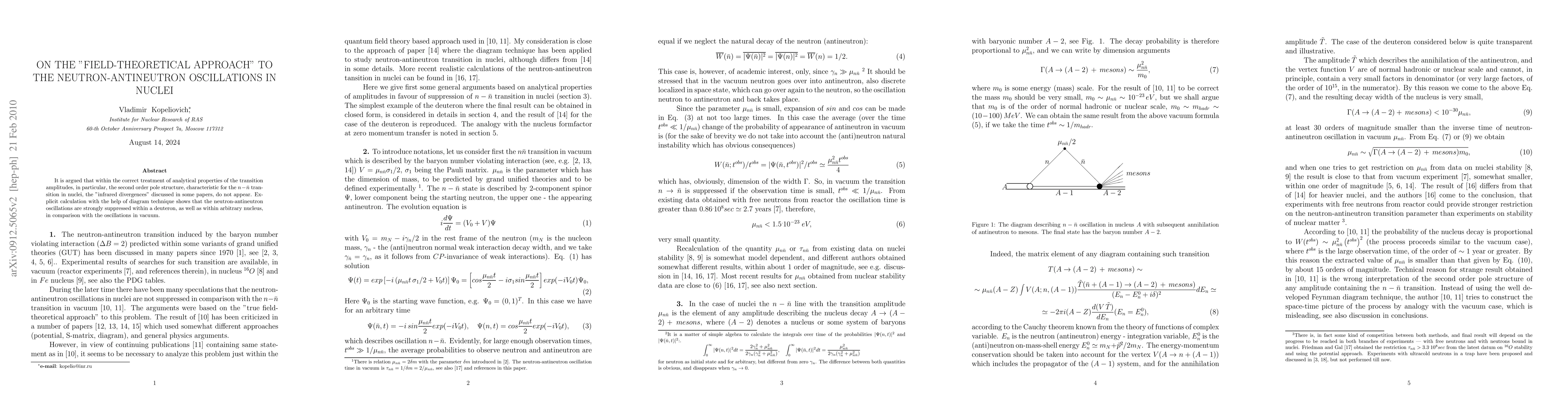It is argued that within the correct treatment of analytical properties of the transition amplitudes, in particular, the second order pole structure, characteristic for the $n - \bar n$ transition in nuclei, the "infrared divergences" discussed in some papers, do not appear. Explicit calculation with the help of diagram technique shows that the neutron-antineutron oscillations are strongly suppressed within a deuteron, as well as within arbitrary nucleus, in comparison with the oscillations in vacuum.